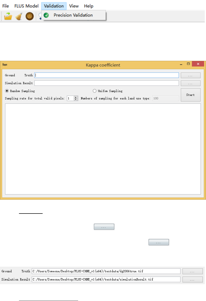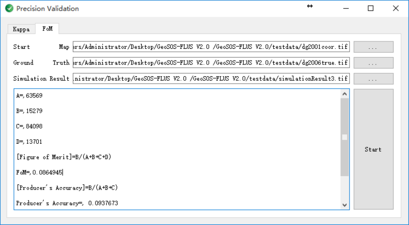 GeoSOS-FLUS 软件提供精度验证模块,提供 Kappa 系数和 FoM两种指标对