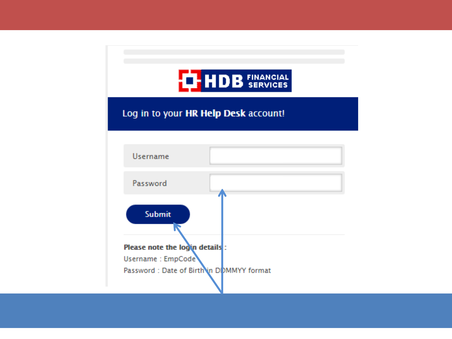 Enter your Employee Code with HDBFS and Date of Birth in DDMMYY format and click