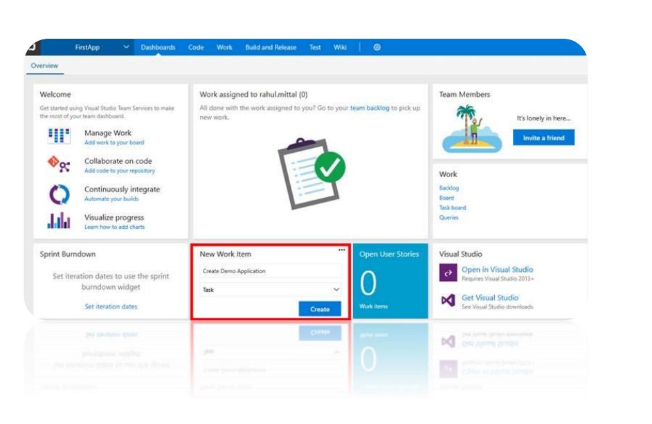1. Go to VSTS dashboard and create a task. We will associate this task with check-in.