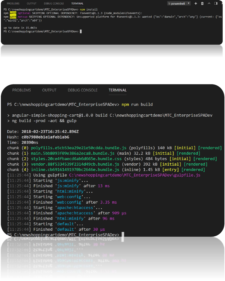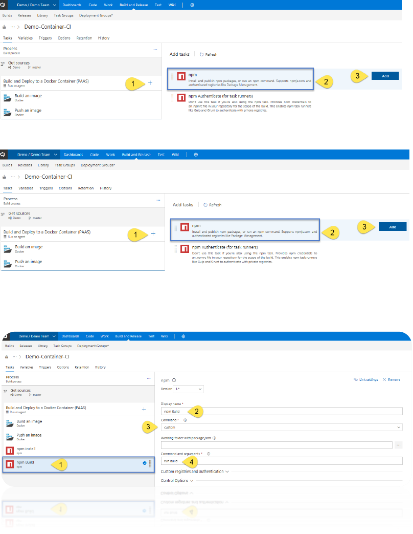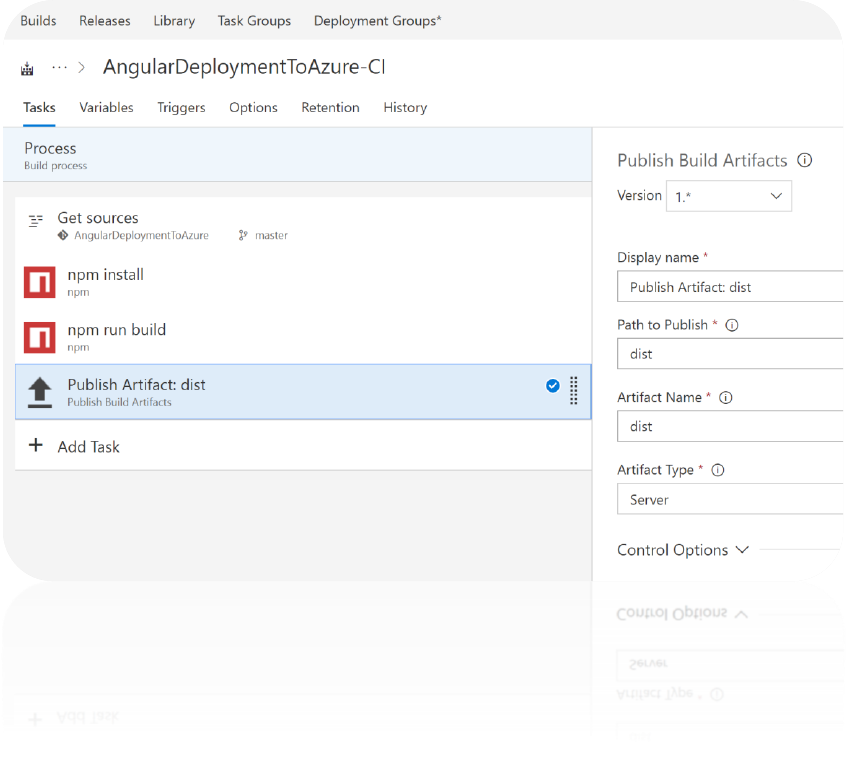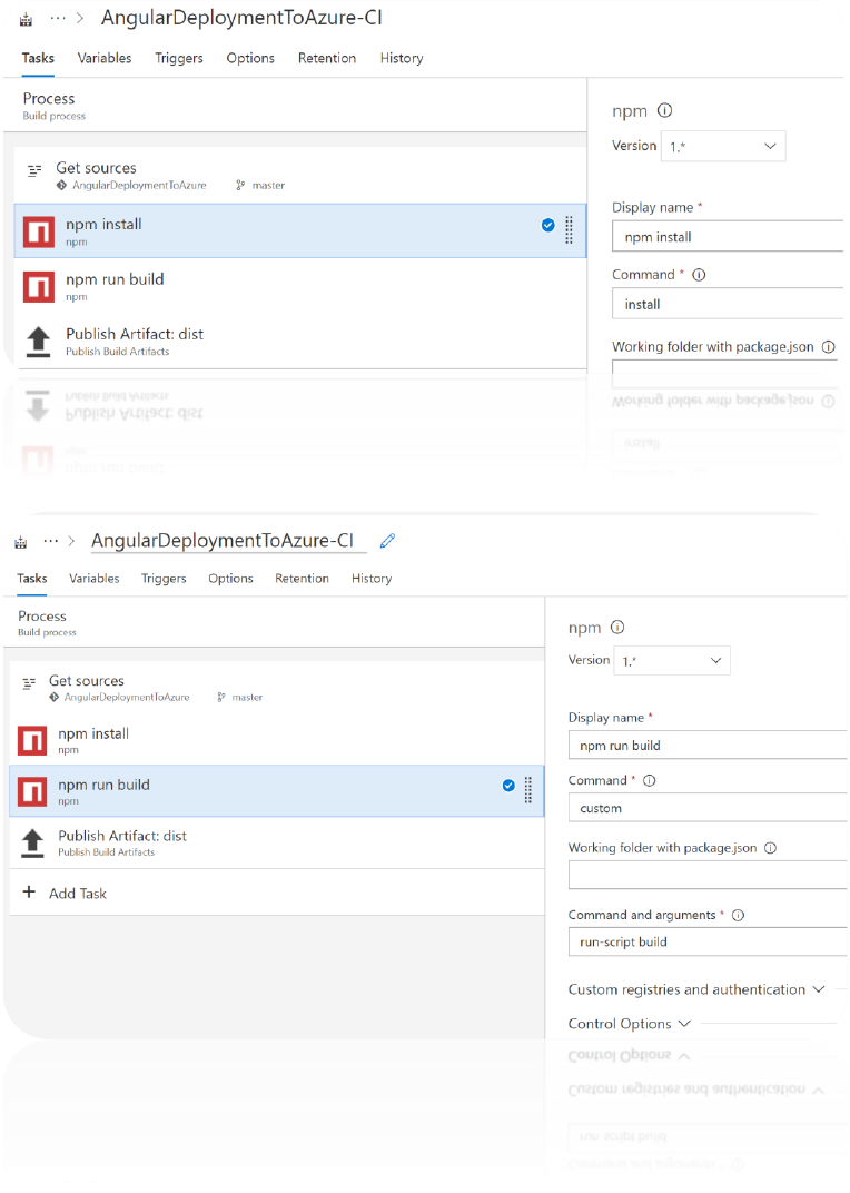 8. Add Node Package manager “Install” & “Build” steps to build the Angular Application: