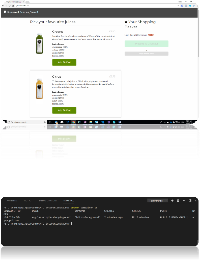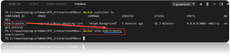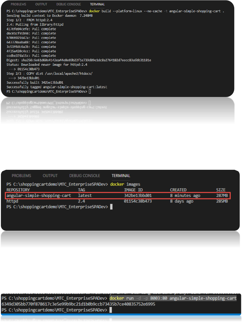 8. In the Terminal Run: “docker run -d -p 8003:80 angular-simple-shopping-cart”. Where