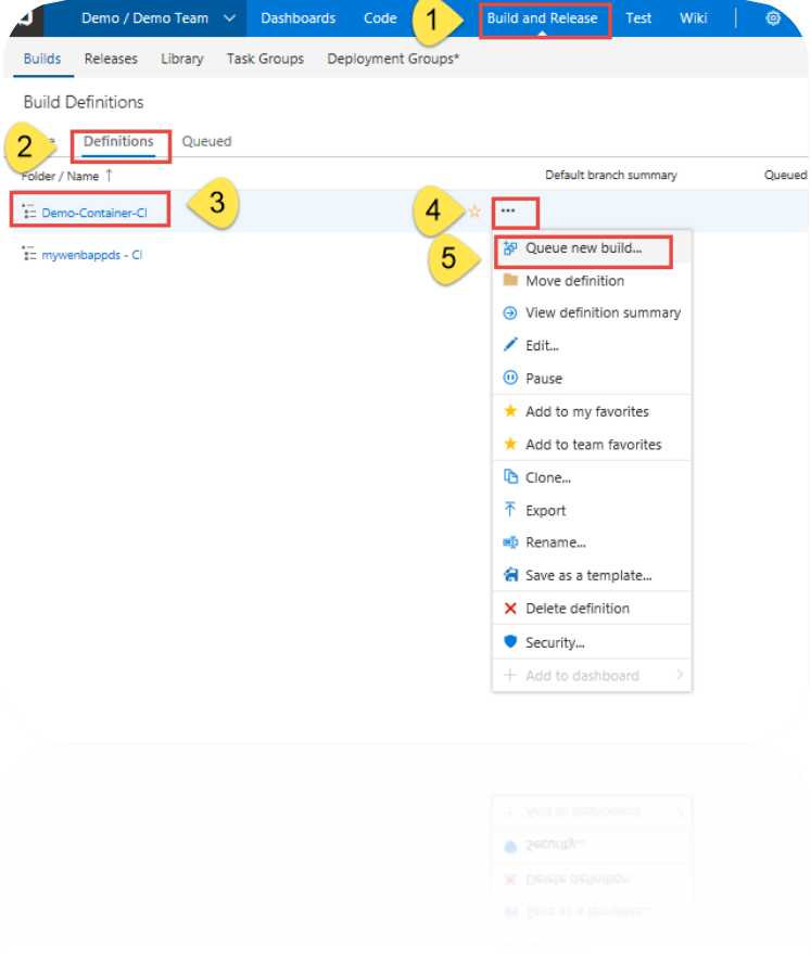 4. Configure a new Build and Deployment Definition for CI / CD. Use your Demo VSTS