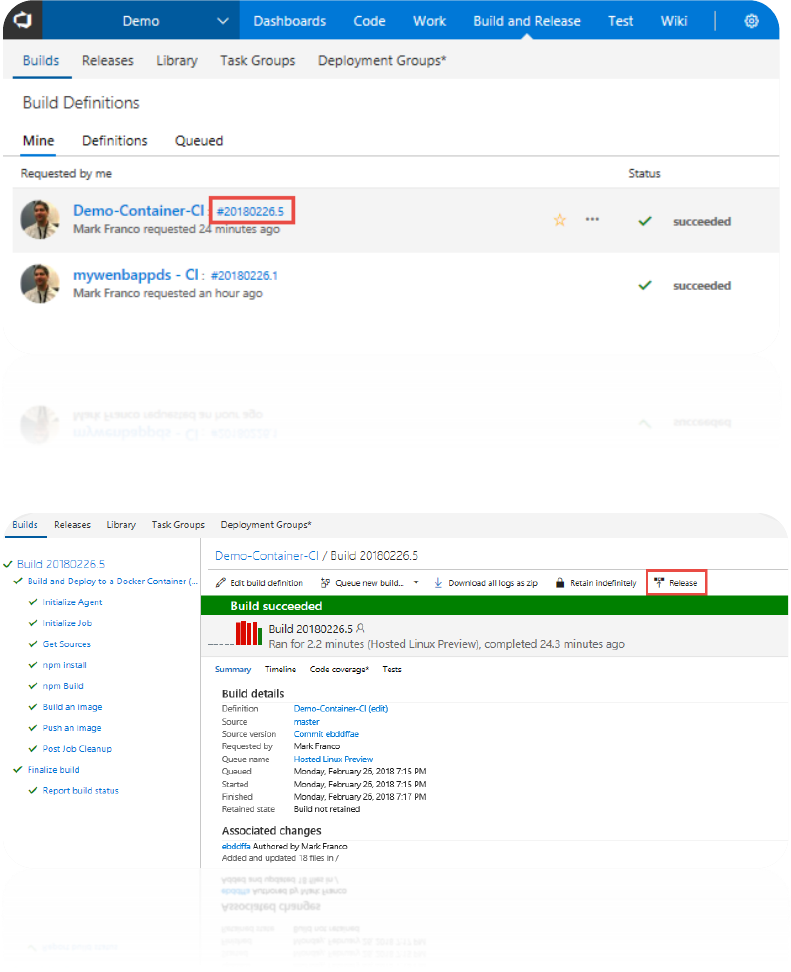 16. In the build summary page, choose the Release icon to start a new release definition.