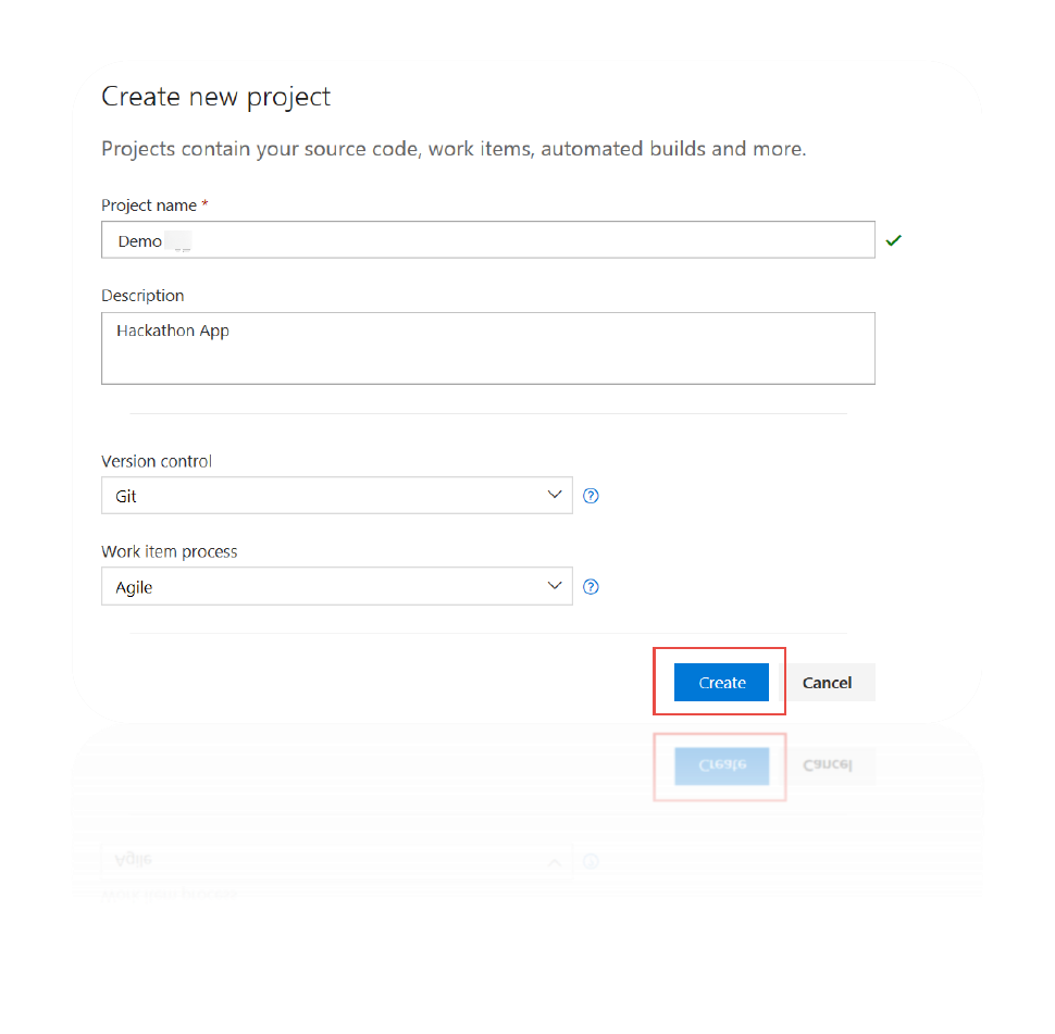 3. Enter Project Name, Description, Version control, and Work item process and click Create.