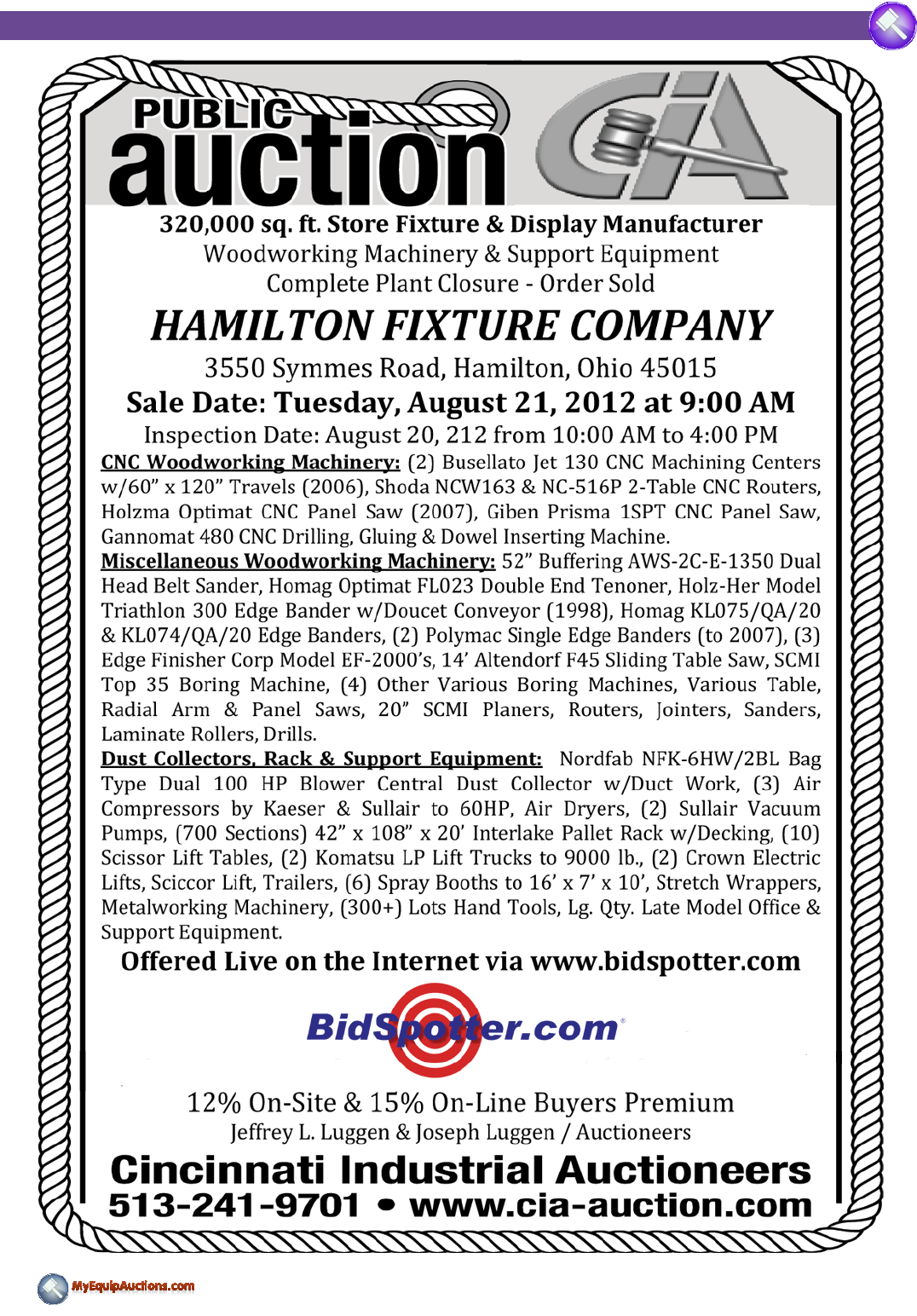 08/21/12 Cincinnati Industrial Auctioneers 513-241-9701 Hamilton Fixture Company On-site/Online Hamilton , OH