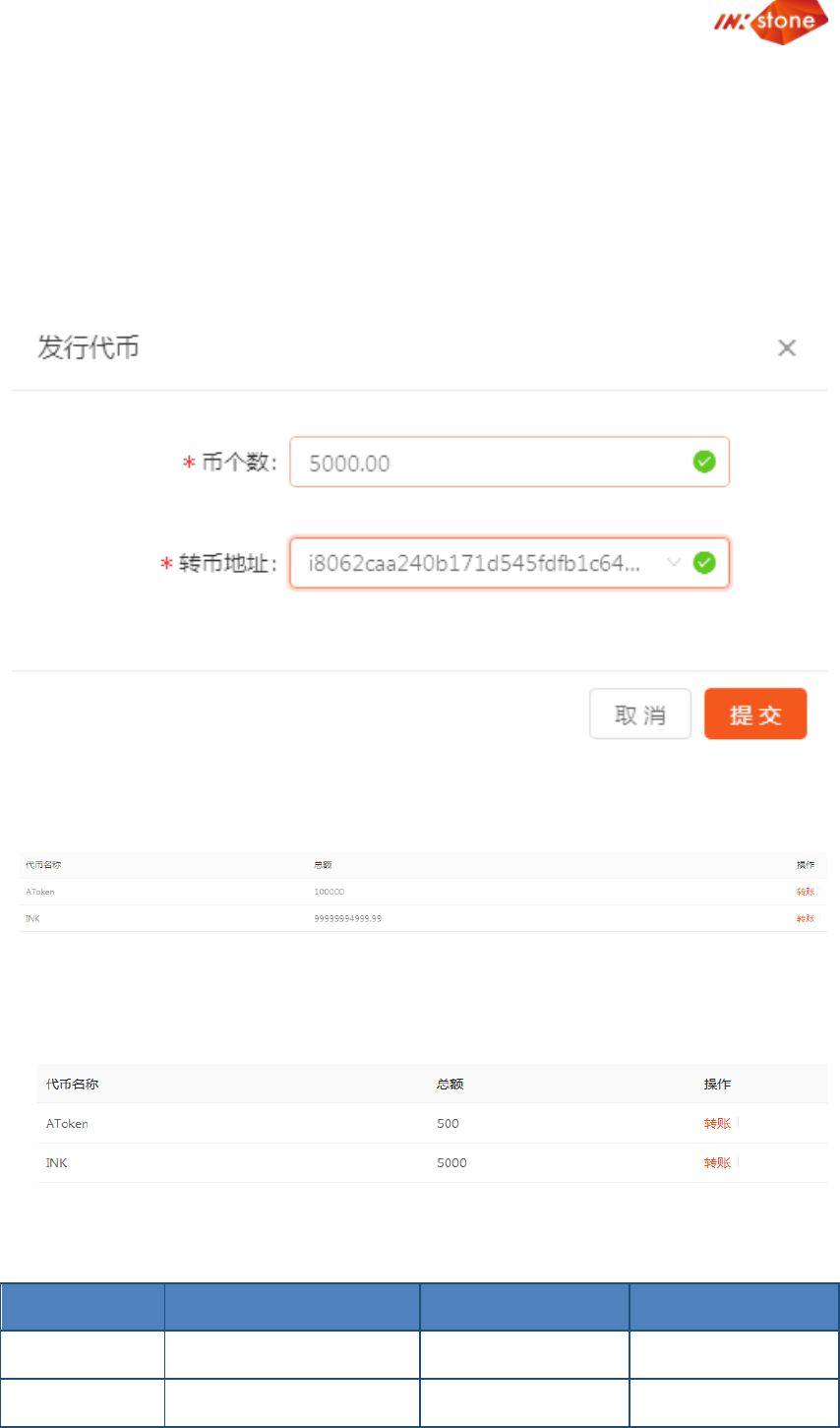 如:点击第二个账户的“转账”——输入币个数(5000)和地址(第一个账户)