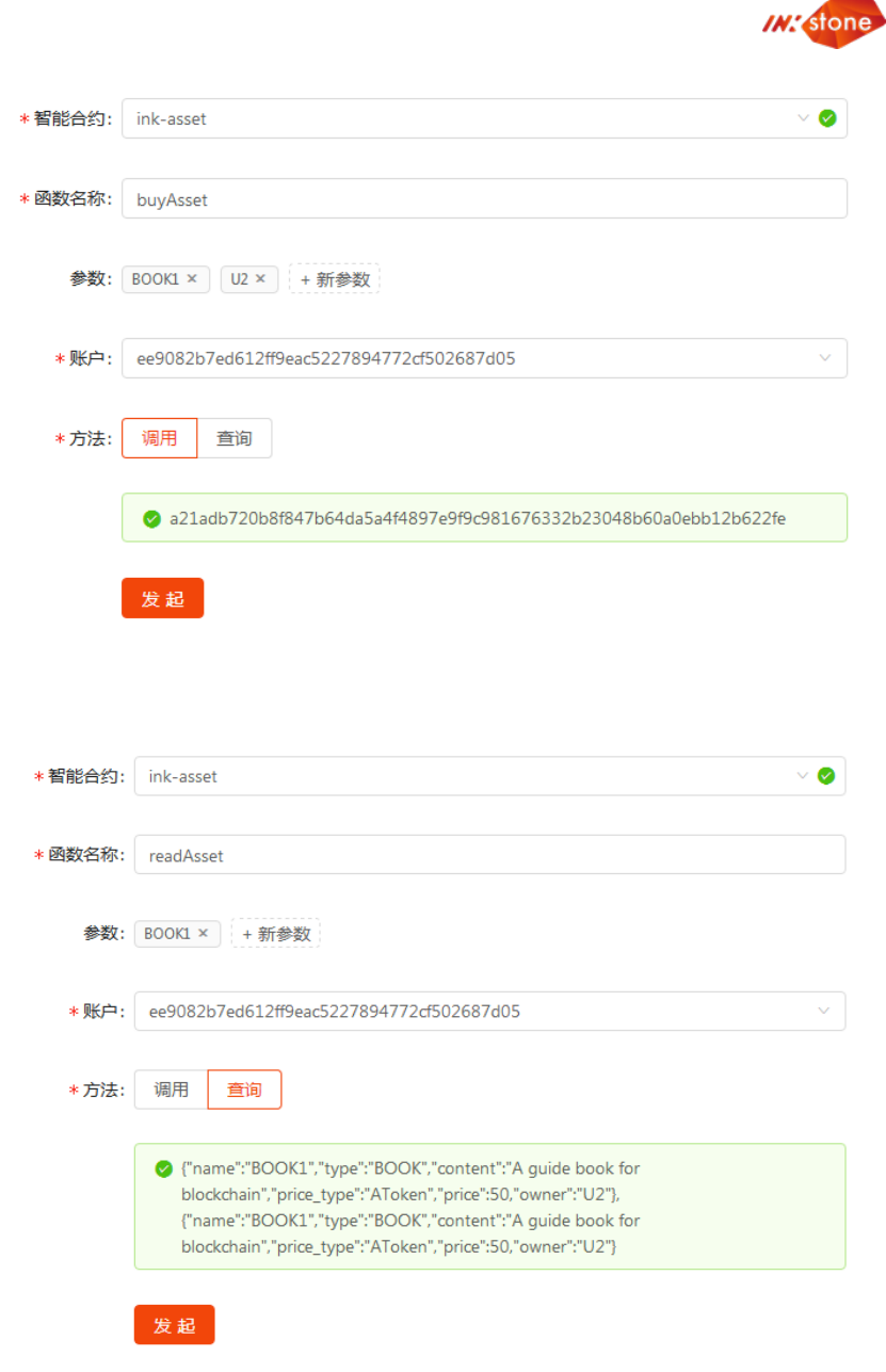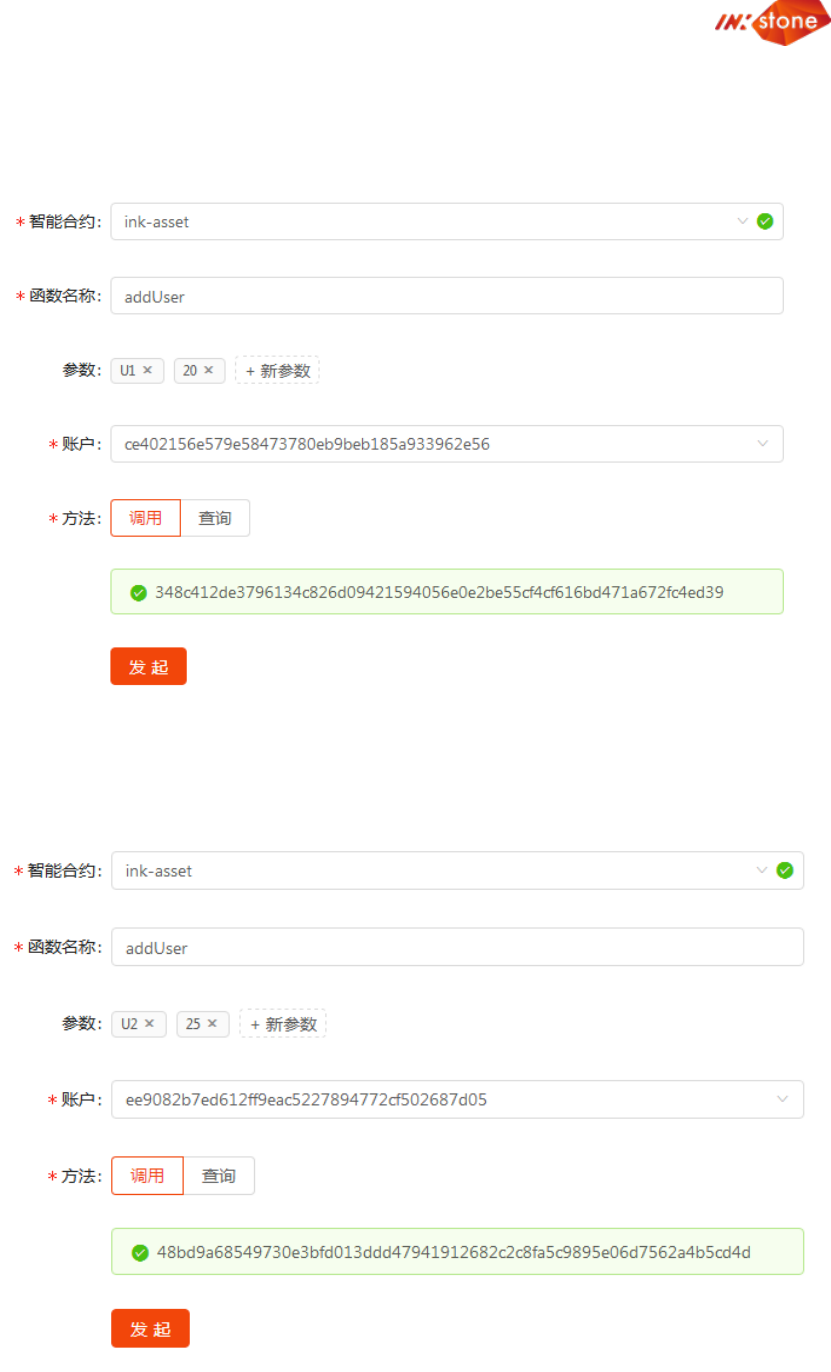 量(50),当前调用用户(U1),点击“发起”发起调用成功。