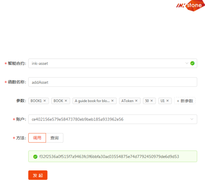 20(年龄),选择账户为:第一个账户,点击调用——发起——调用成功