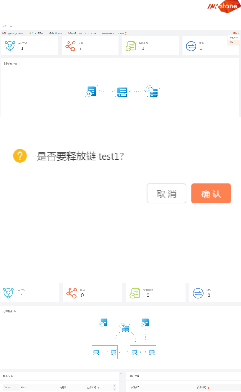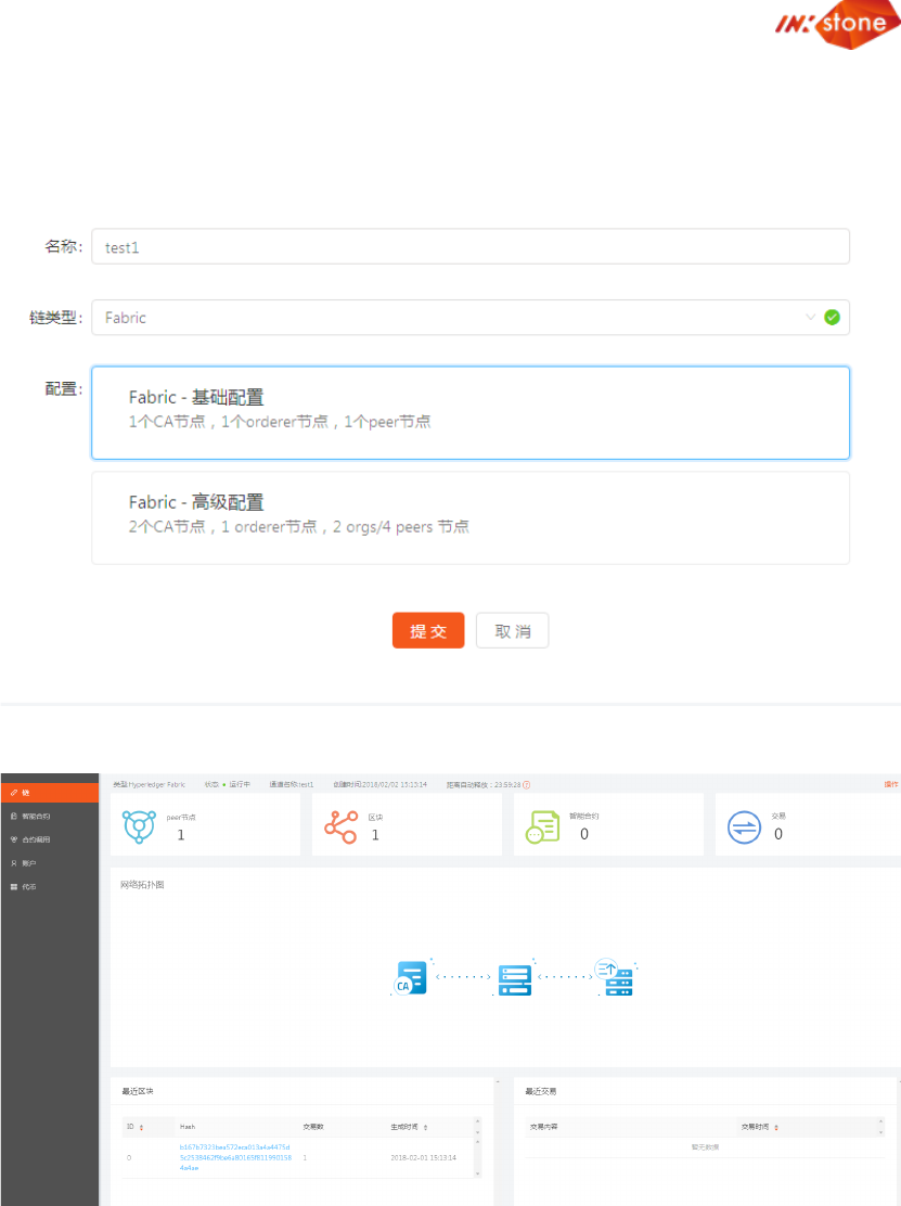 点击上方“新建链”按钮,新建一个区块链——设置名称,类型(当类型为 Fabric