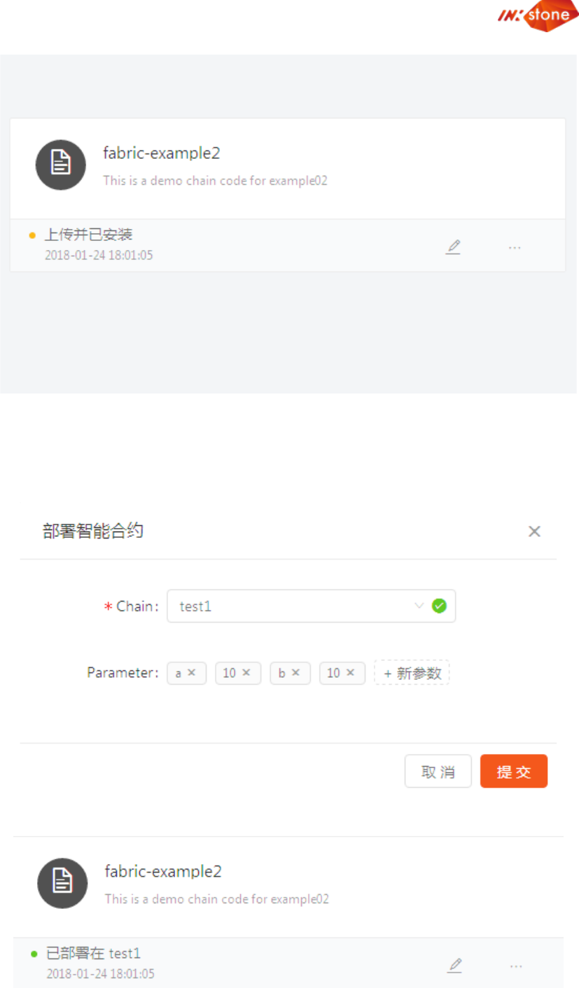 A. 安装合约到 Fabric 链上:点击“Fabric-example 2”右下角“…”“安装”