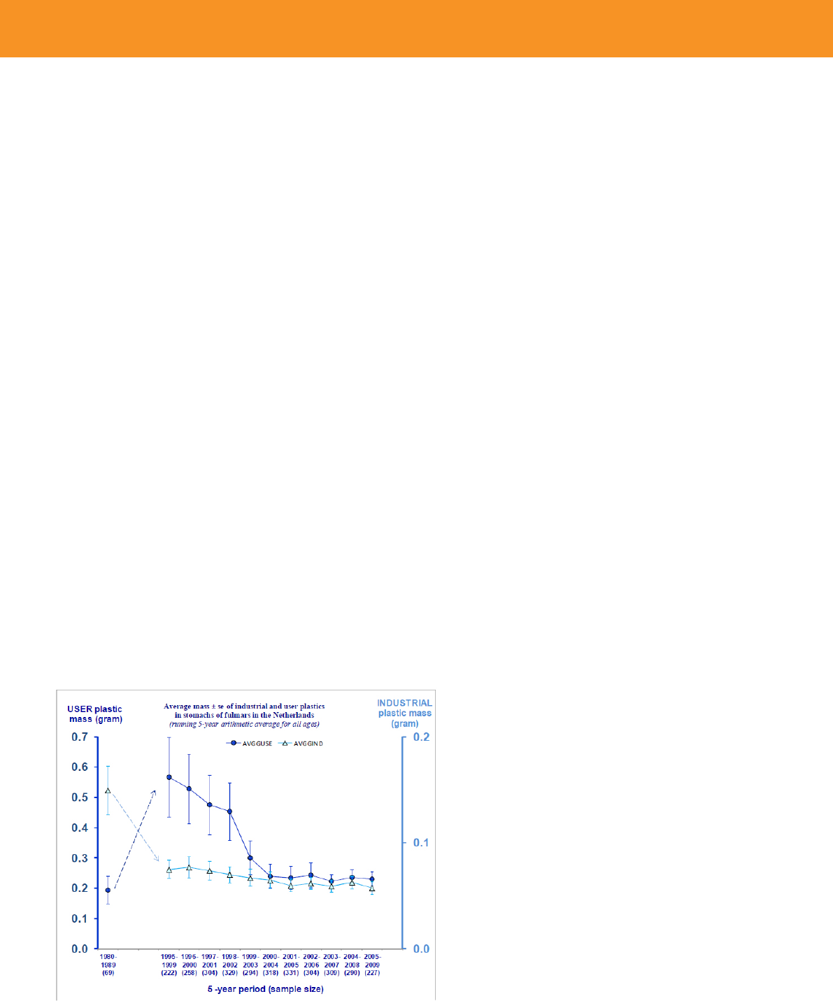 Figure 11: Amount of user and industrial plastic in Fulmar stomachs in Netherlands over time. Van Franeker, J.A.; & the SNS Fulmar Study Group
