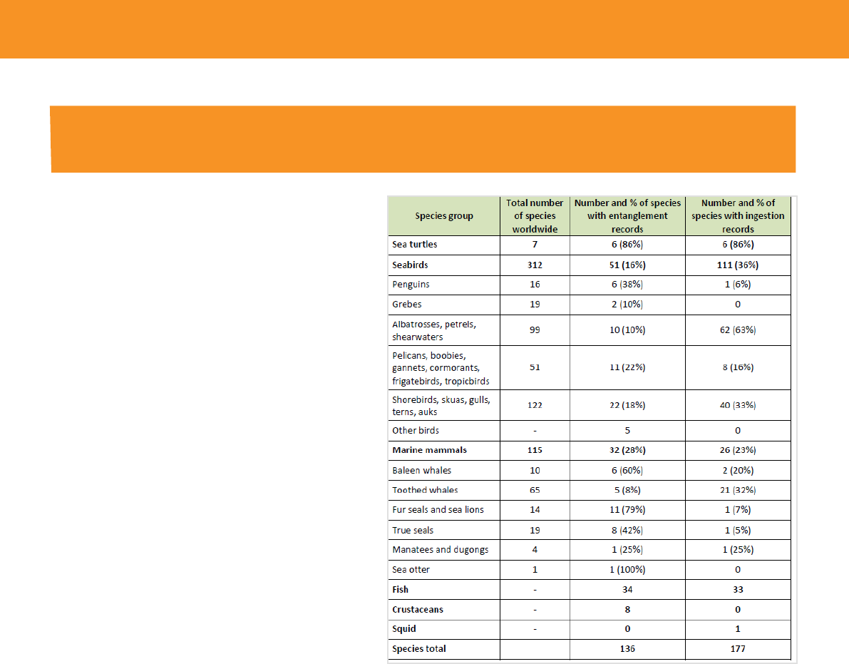 Figure 14: Number and percentage of marine species with documented entanglement and ingestion records. Mudgal et al. (2011) Plastic Waste in