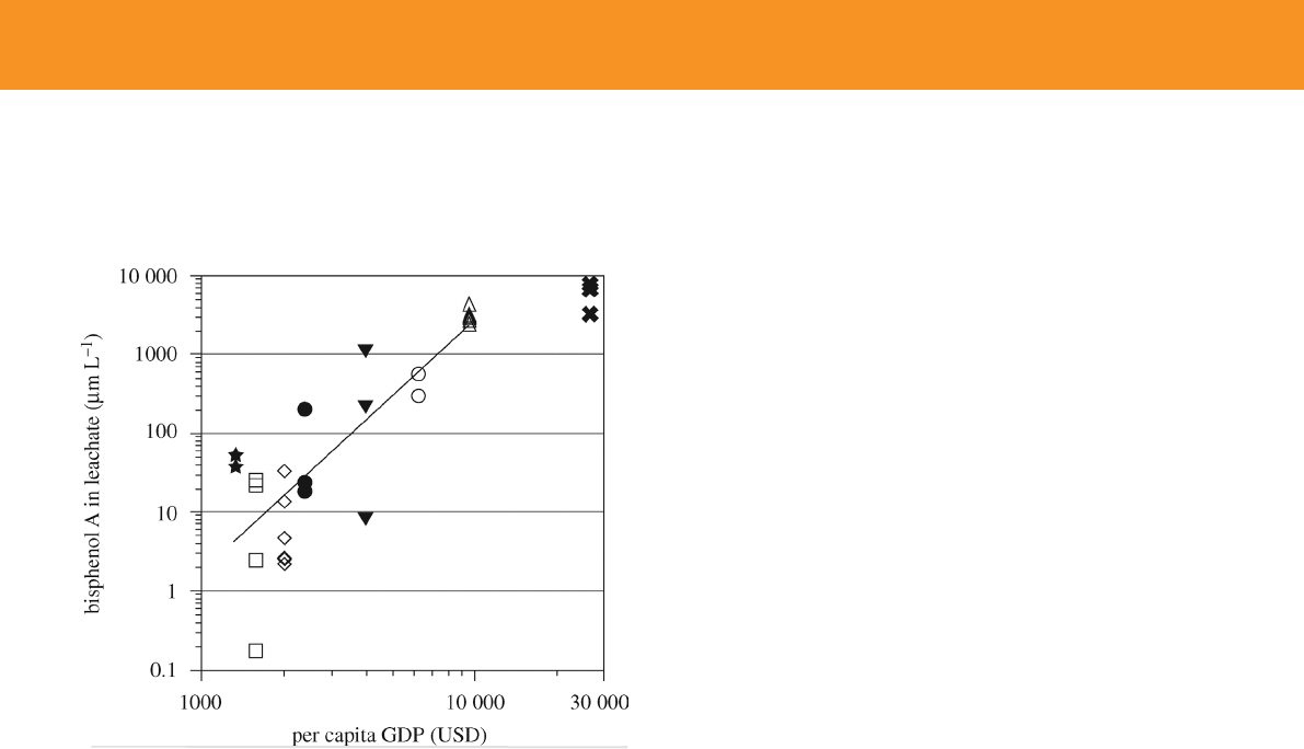 Figure 15: Relationship between BPA concentrations in leachate and per capita GDP of Asian countries. Teuten, E.L., Saquing, J.M., Knappe, D.R.U