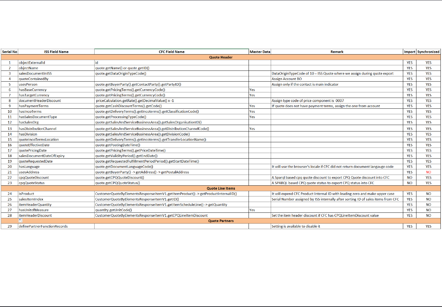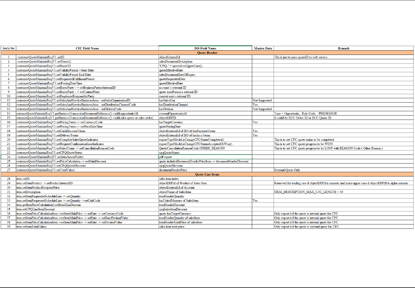 Table 11 ISS and CPQ Quote Data Mapping for Export Process