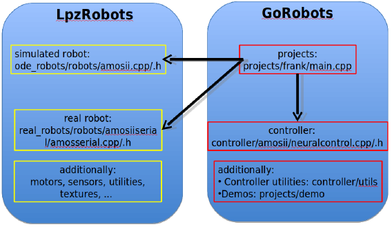 Figure 1: Software Architecture for LpzRobots and GoRobotos