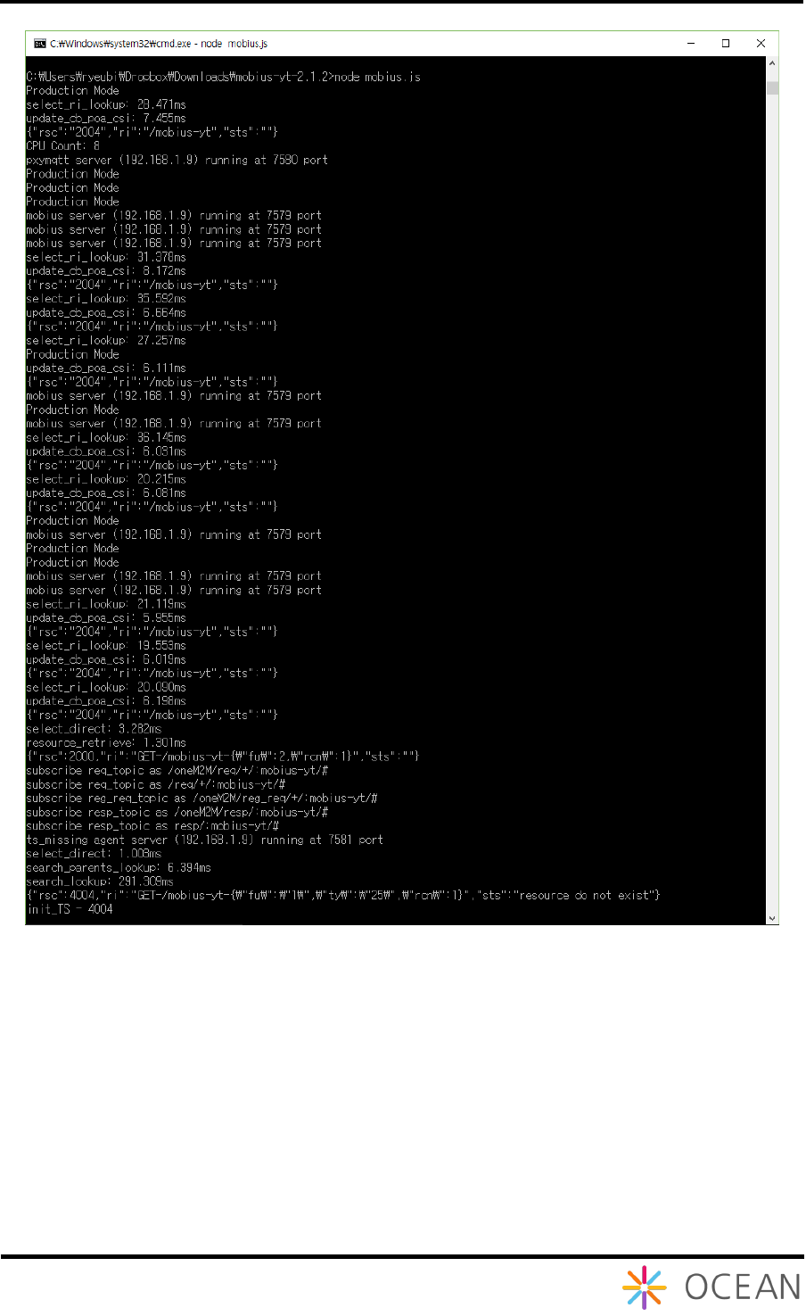 서 ‘node mobius.js’ 명령어를 실행하여 Mobius 서버 플랫폼을 구동할 수 있다.
