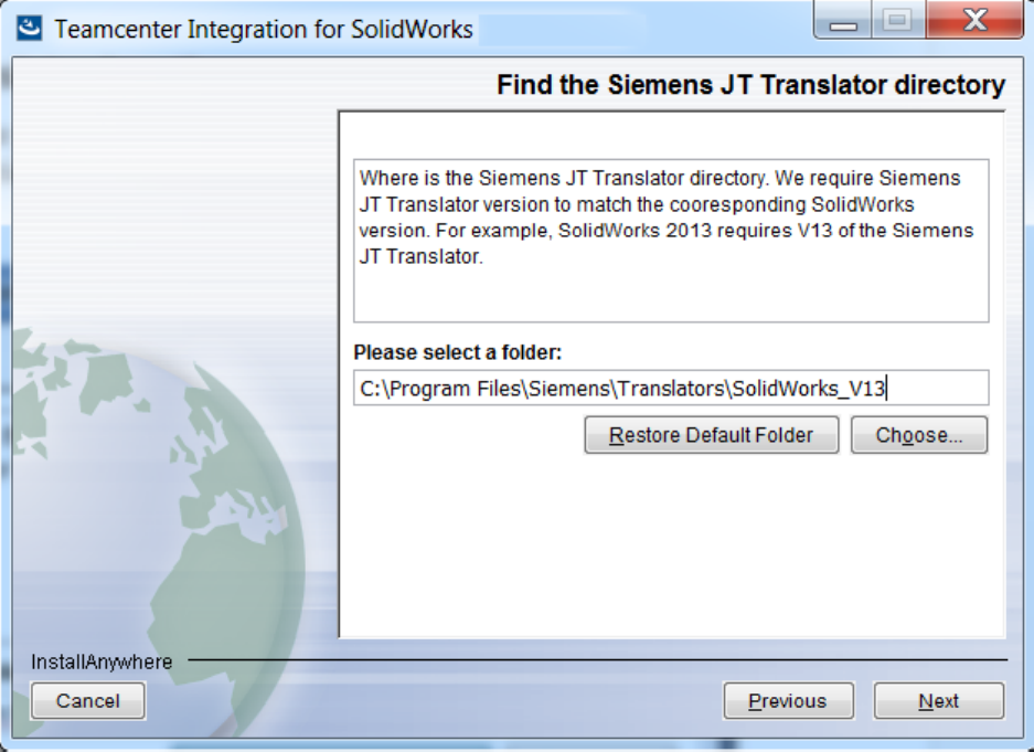 - Select the SolidWorks to JT translator location