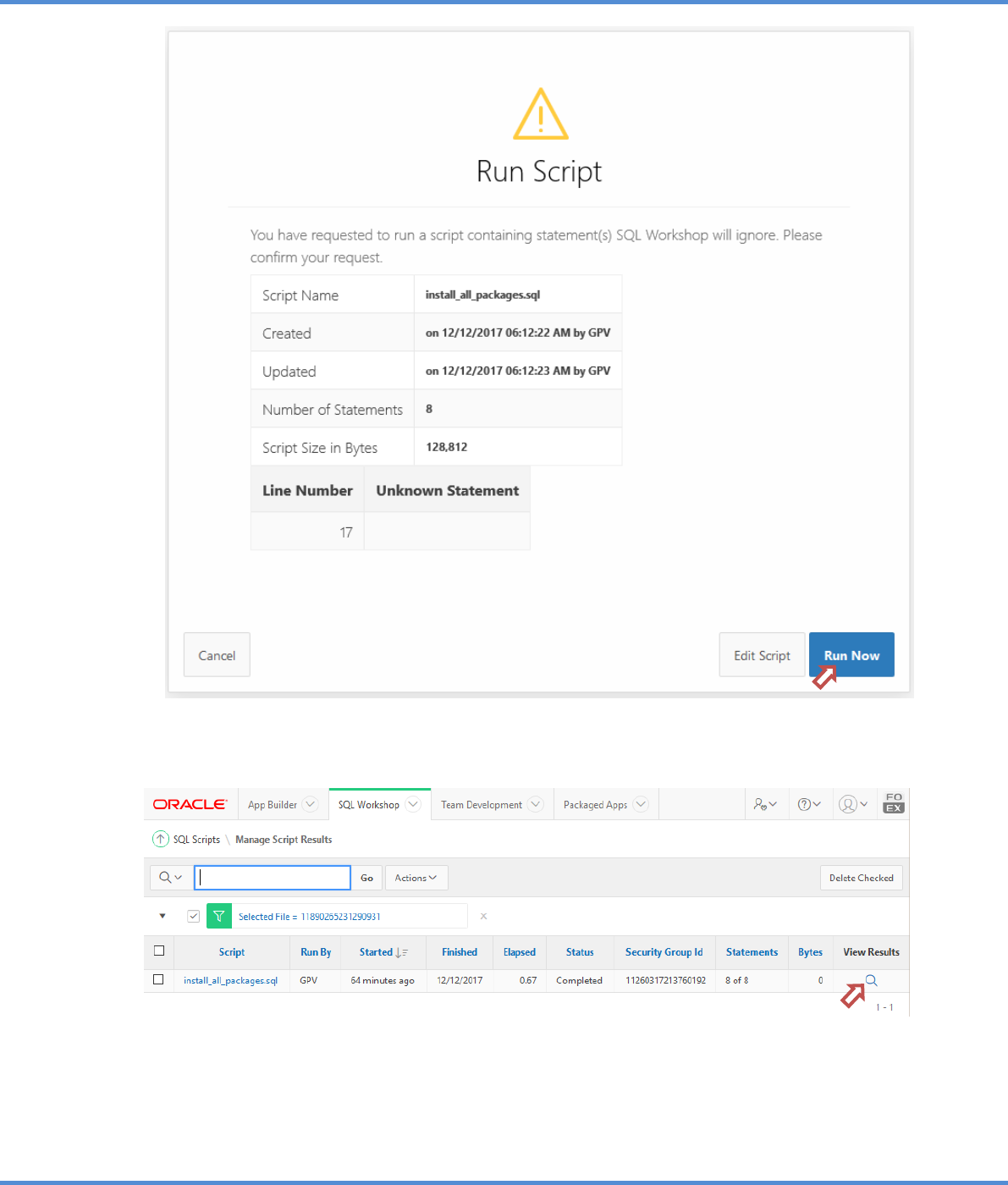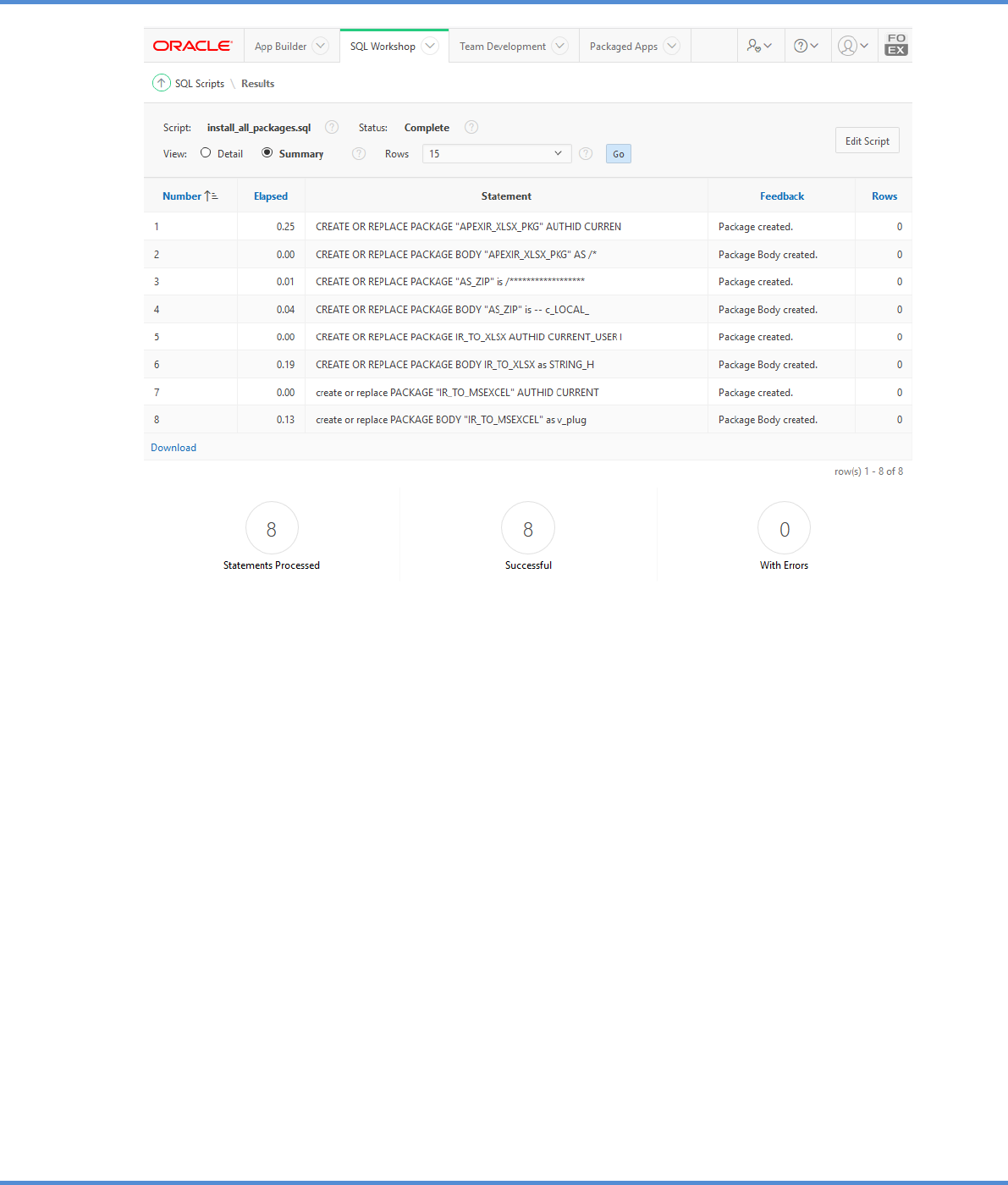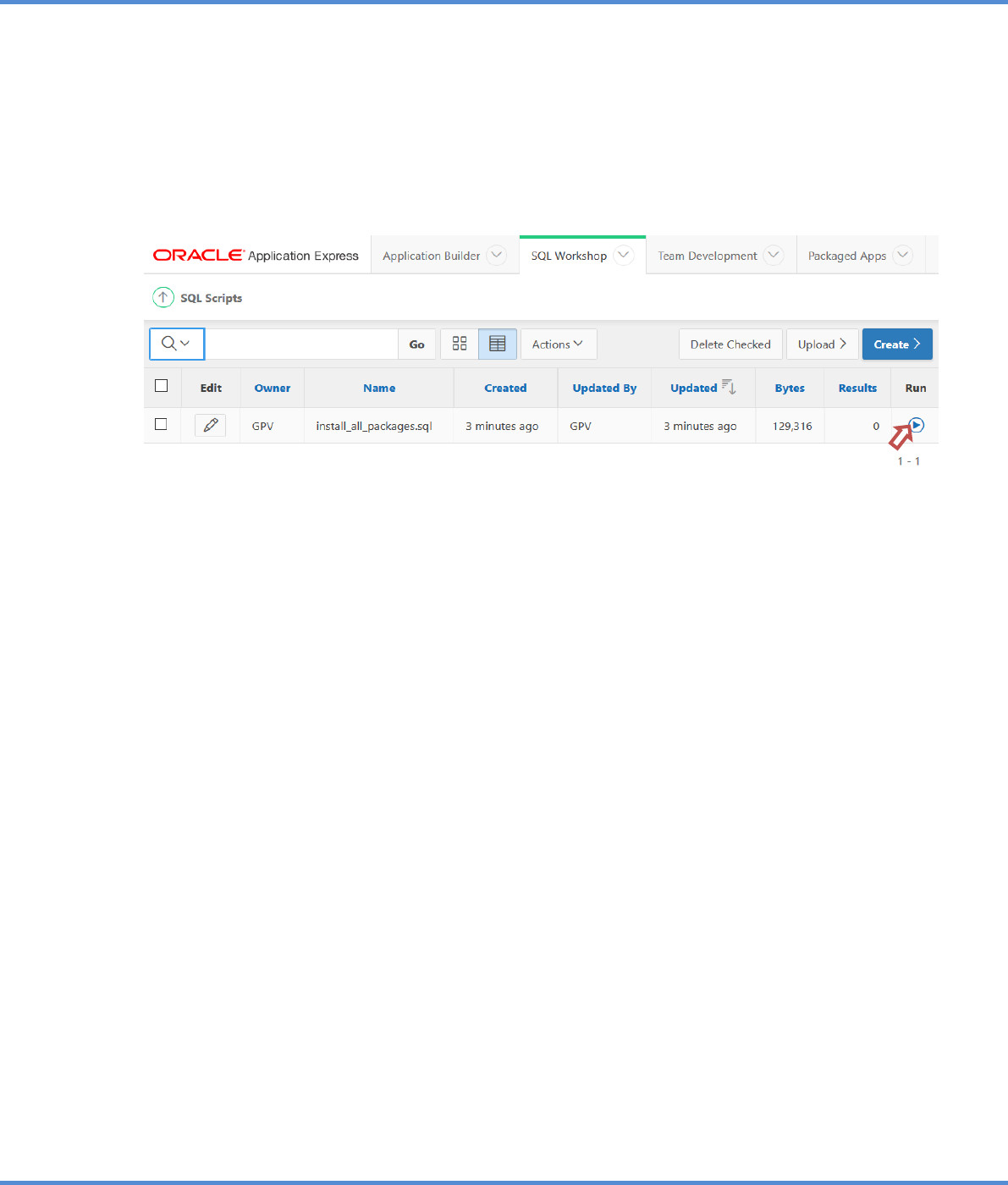 To do this, navigate to the “SQL Workschop > SQL Scripts”. Upload file install_all_packages.sql.
