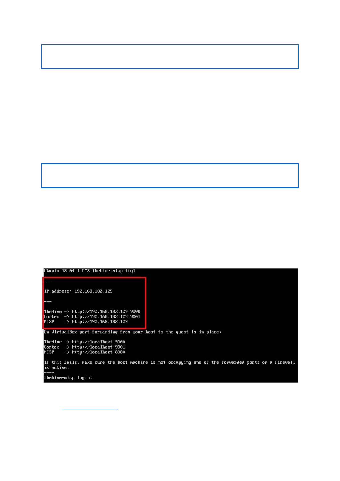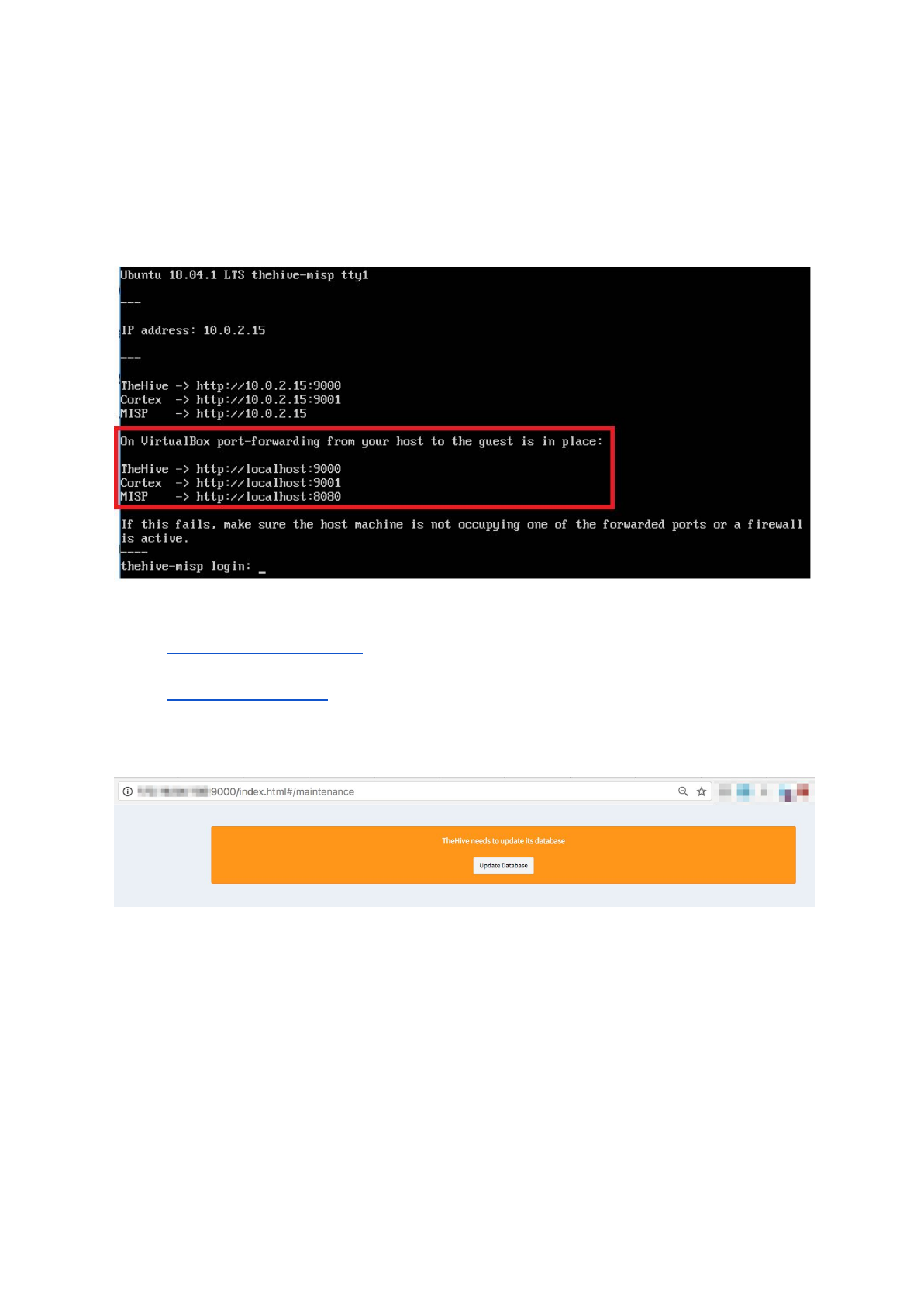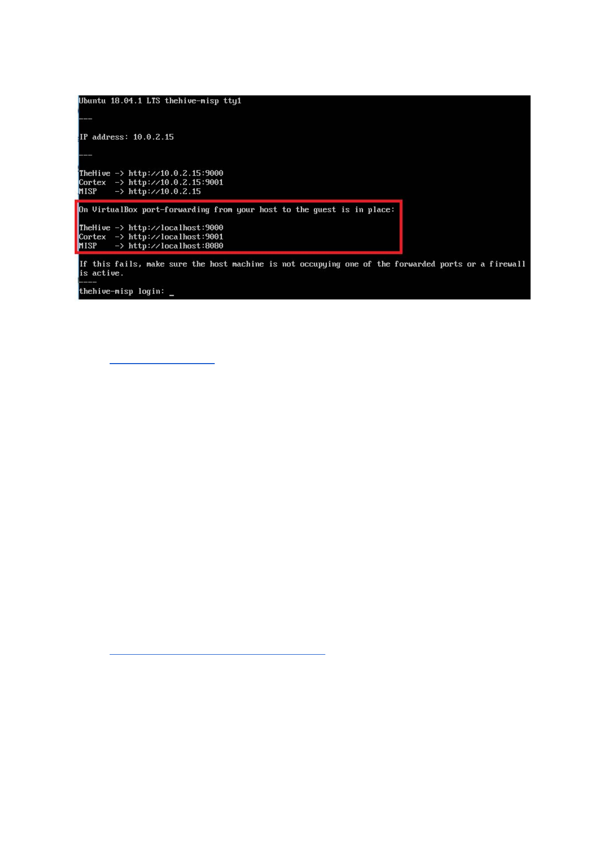 As indicated, port-forwarding is already configured and as such you can access MISP by