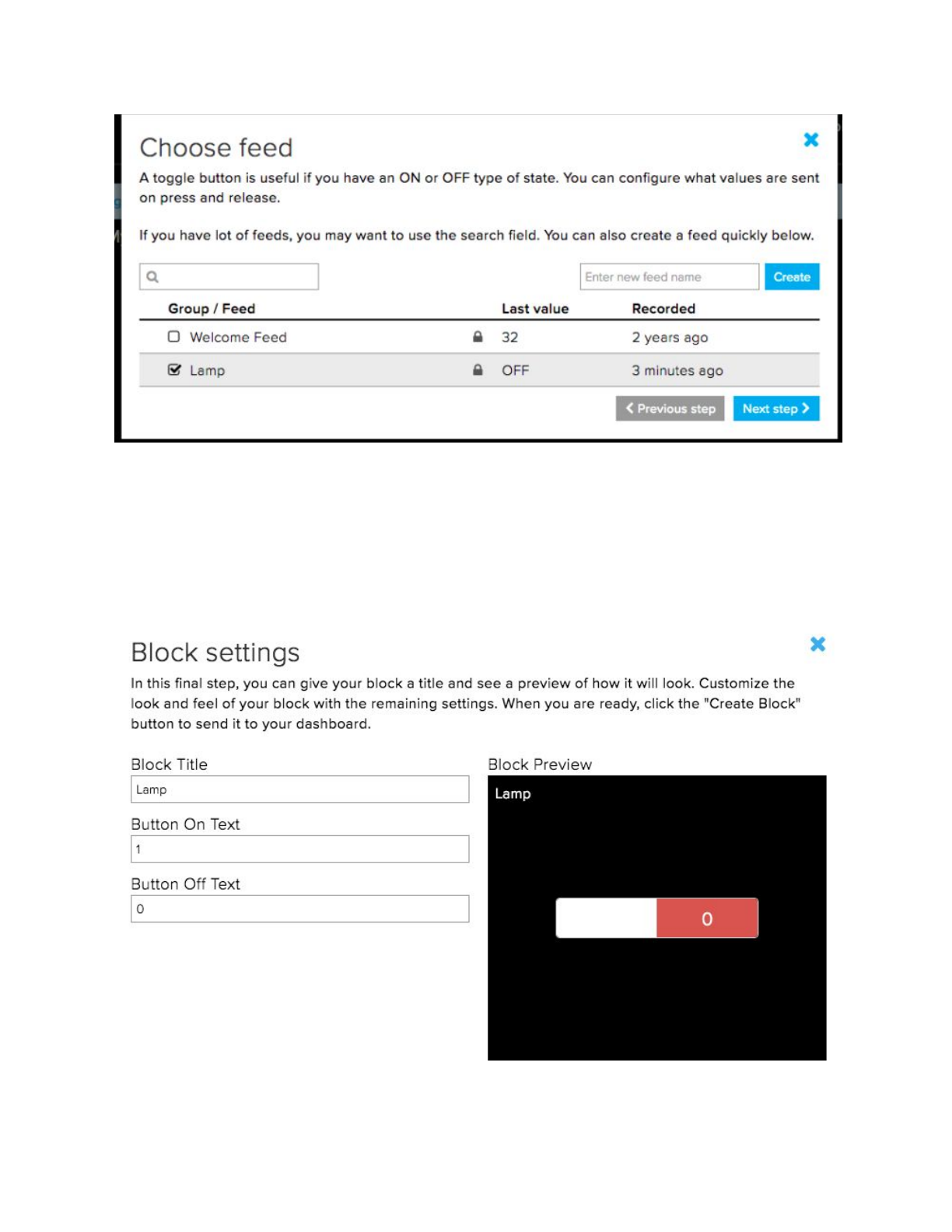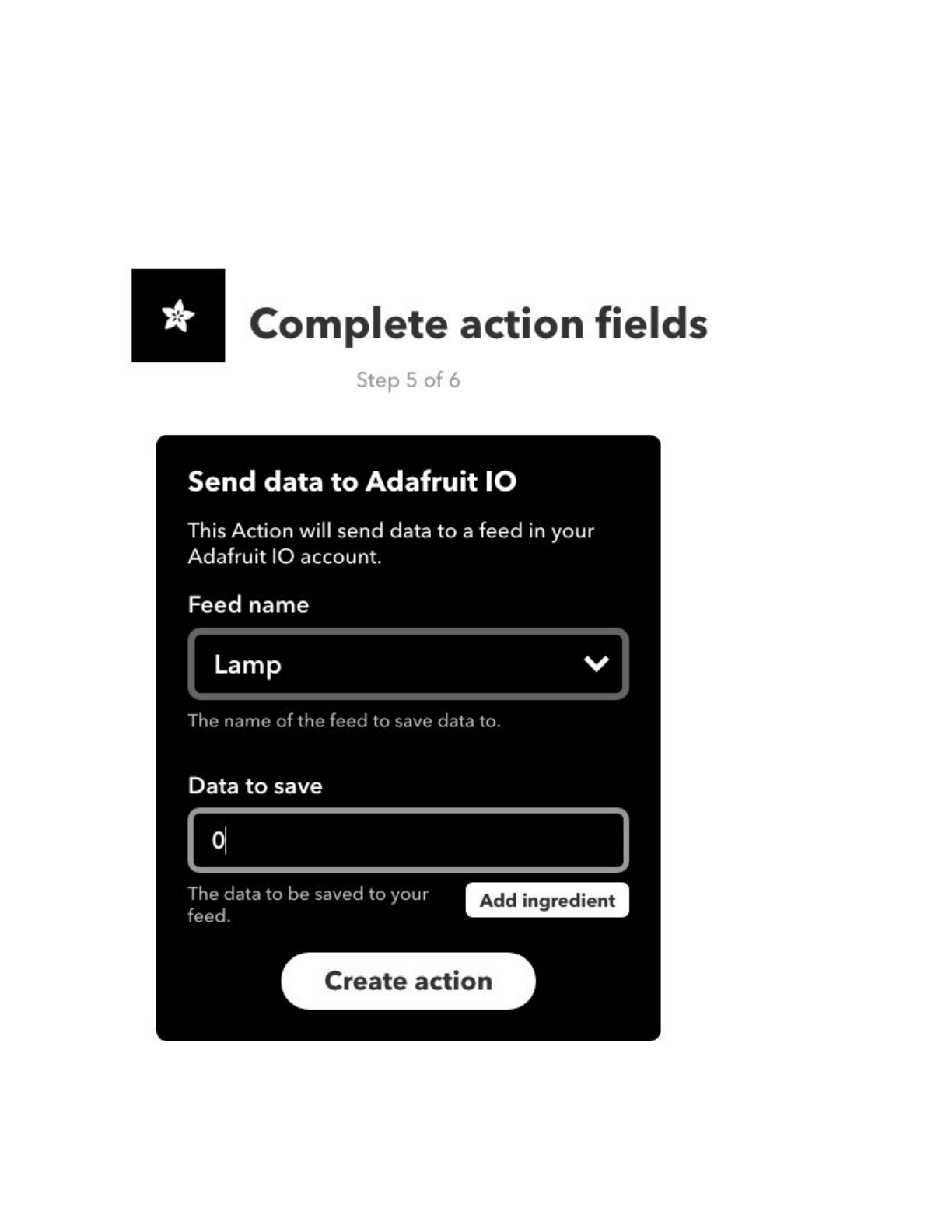 name of the Adafruit IO feed you want to send data to, in this case “Lamp”. The second field