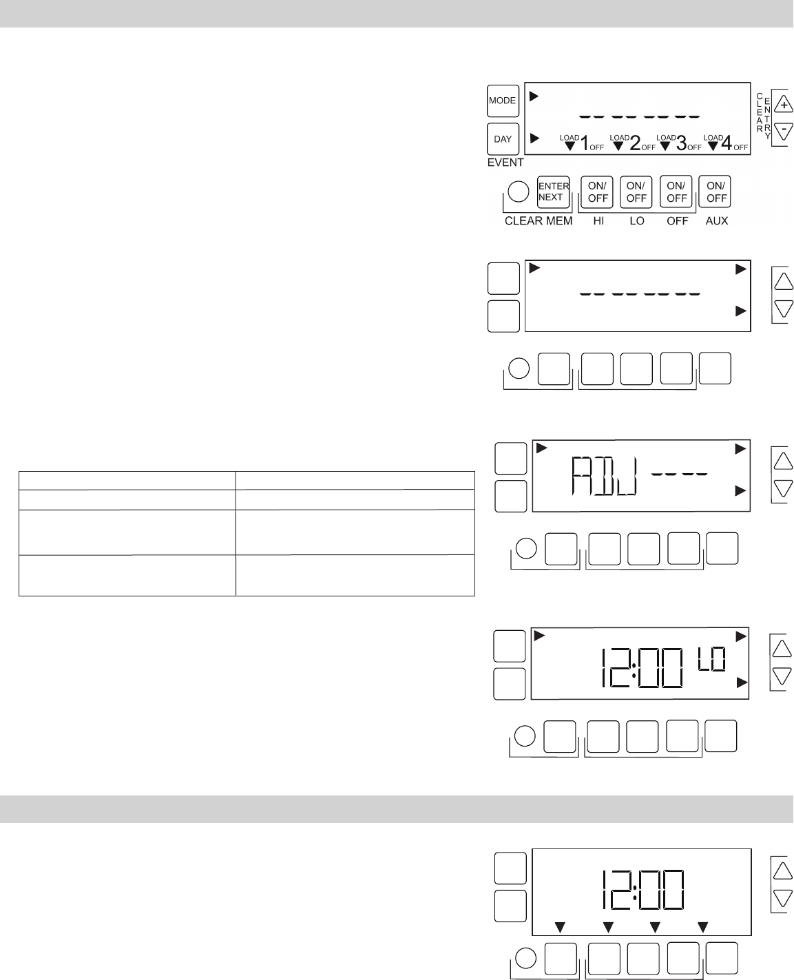 time, year, SET ADJ, and DST screens and advance to the LO ON event. From there,