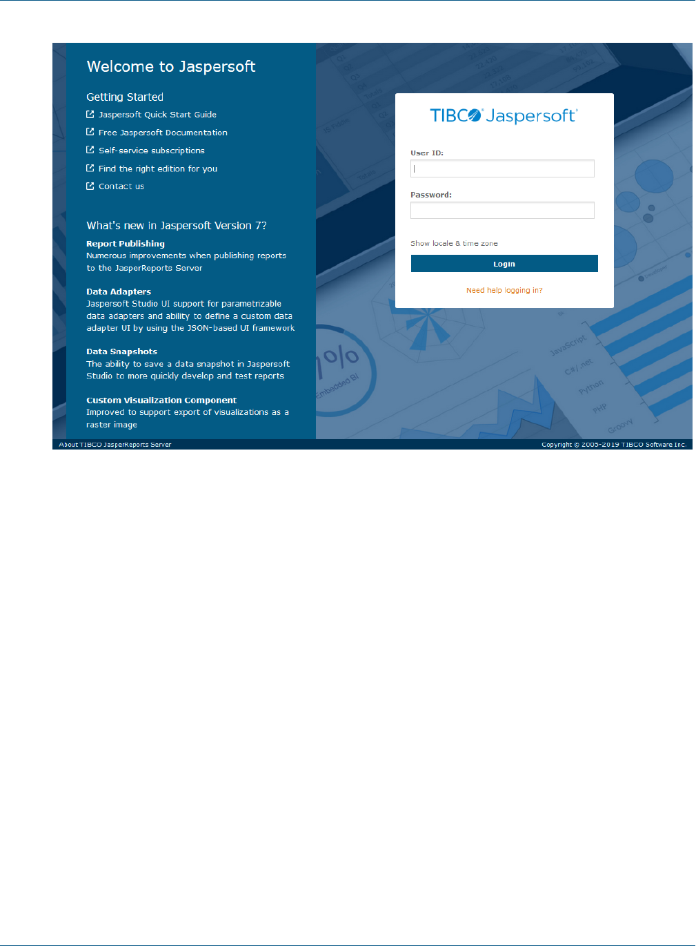 TIBCO, the TIBCO logo, Jaspersoft, JasperReports, and Visualize.js are registered trademarks of TIBCO Software Inc. in the United States and/or other