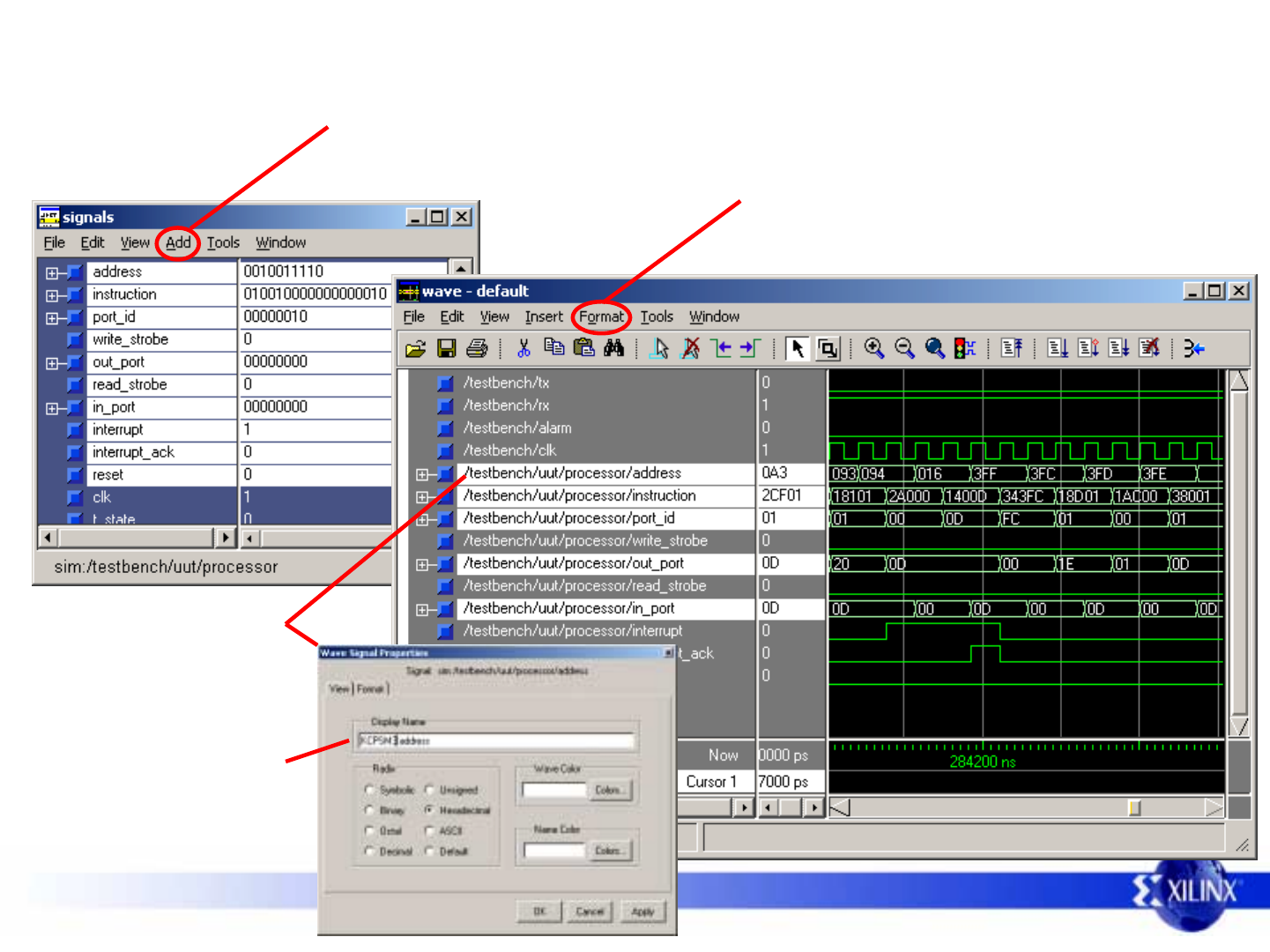 Once the variables are included in the wave display they can be formatted (name and radix) in just the same way as signals