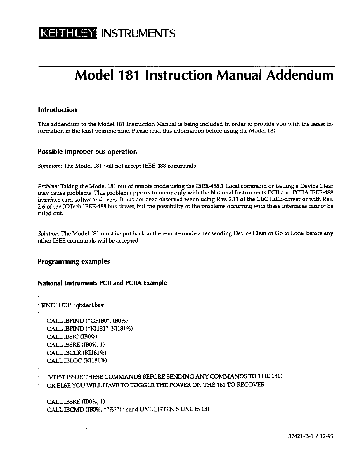 Solution: The Model 181 must be put back in the remote mode after sending Device Clear or Go to Local before any