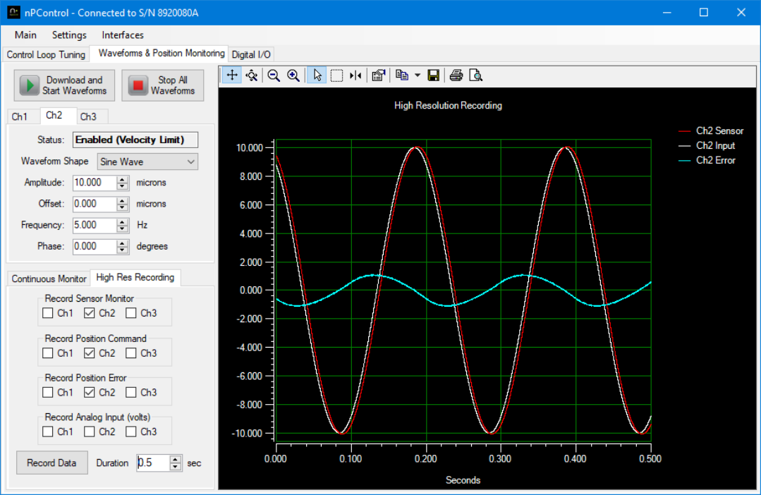 The position error can be recorded in the High Resolution Recording section of nPControl Waveform tab. Below is an