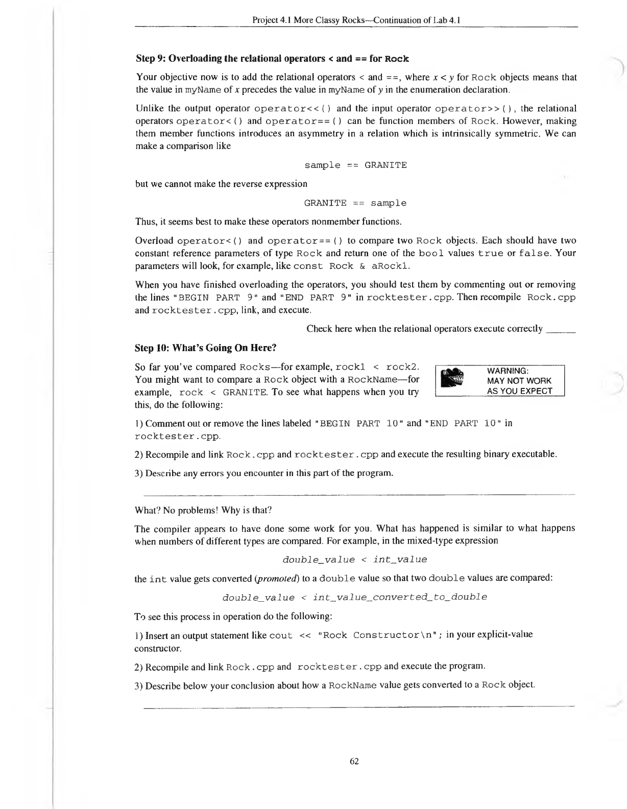 relational operators to your Rock class and an increment operator. This will produce a class that is fairly