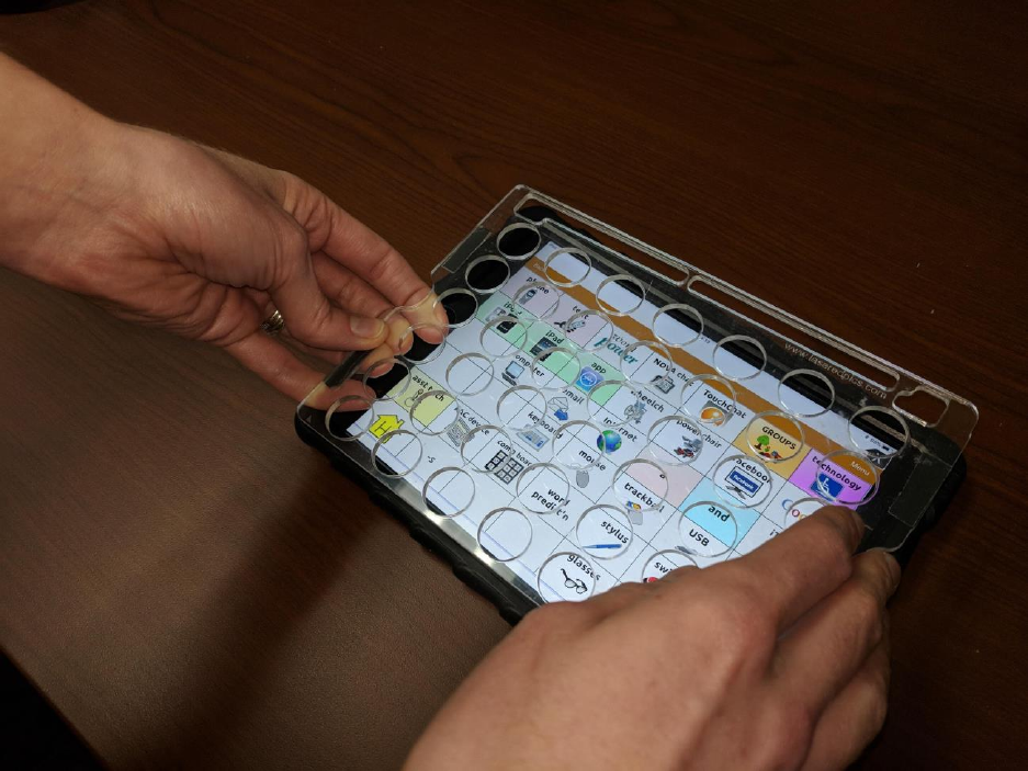 A keyguard is a thin plate that sits over top of an AAC device. The keyguard can help a user use