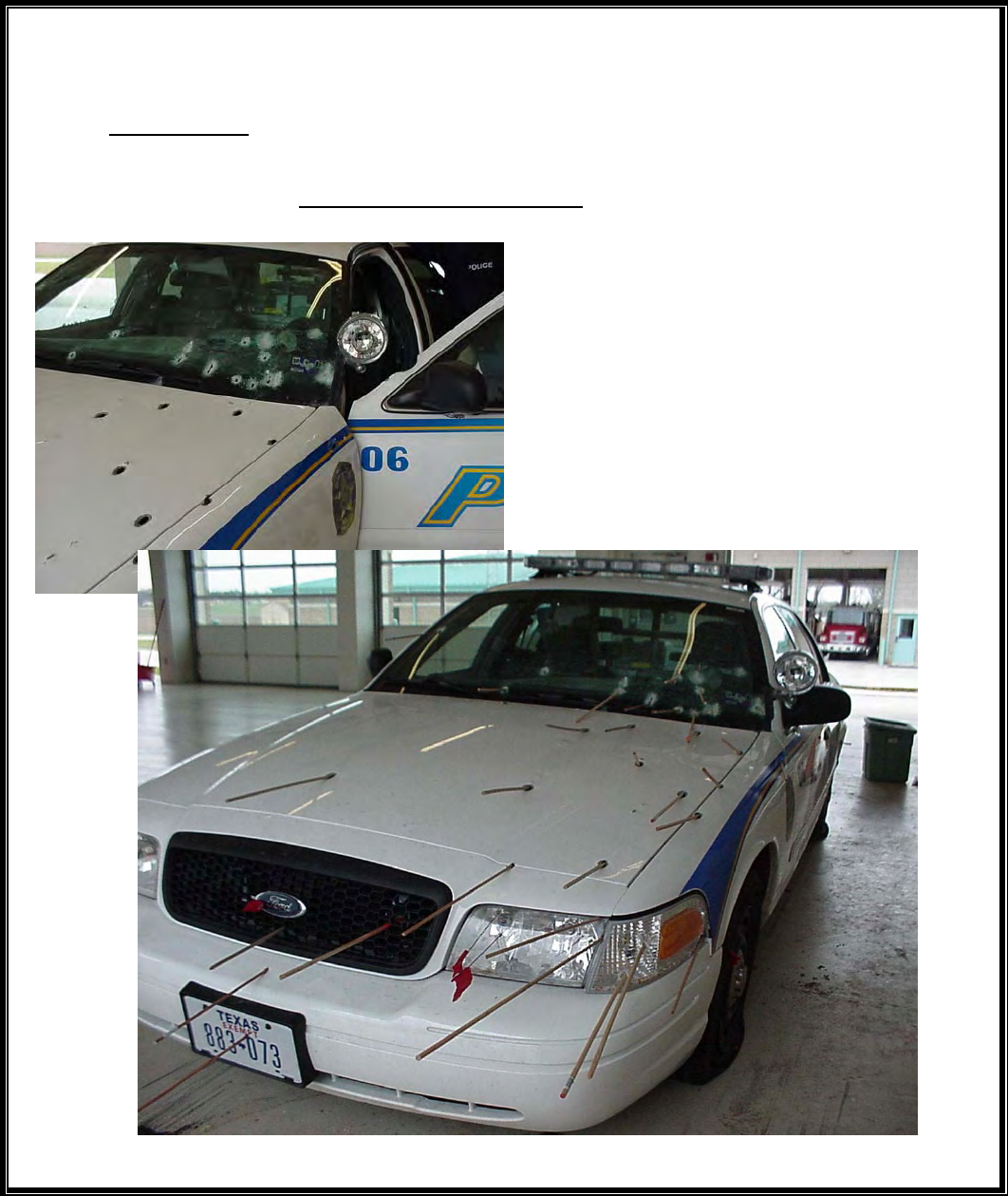 cruiser had been hit 30 times; however the officer was unhurt. The suspect was shot 2 times by the
