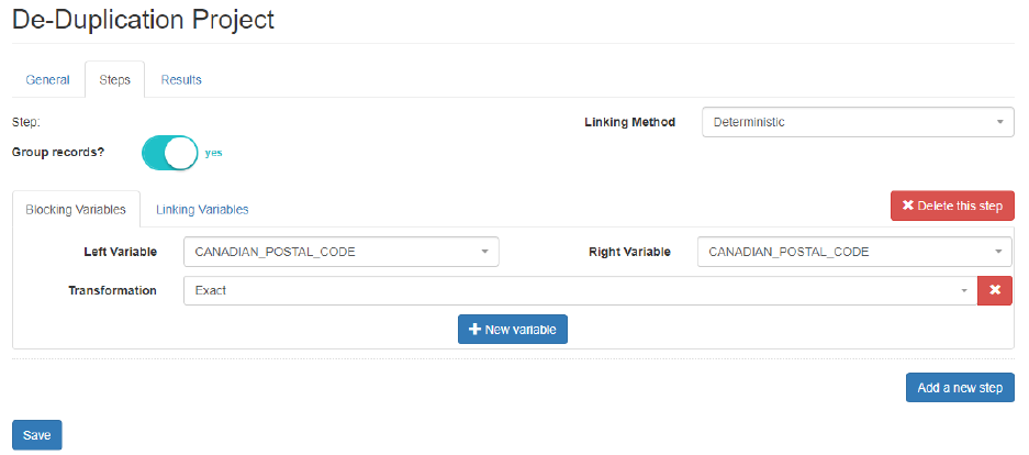 Within a project you can create one or more steps. Each step consists of blocking and linking sub-steps.