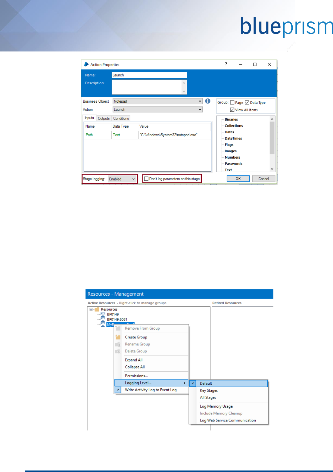 Blue Prism recommends reducing the logged stages to a minimum level and to ensure that no client data is logged