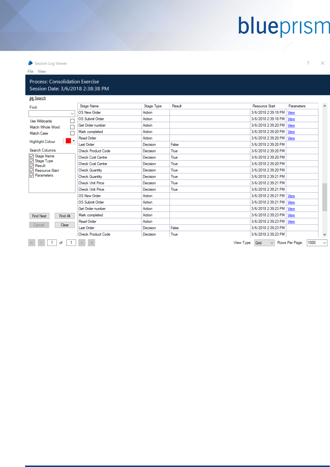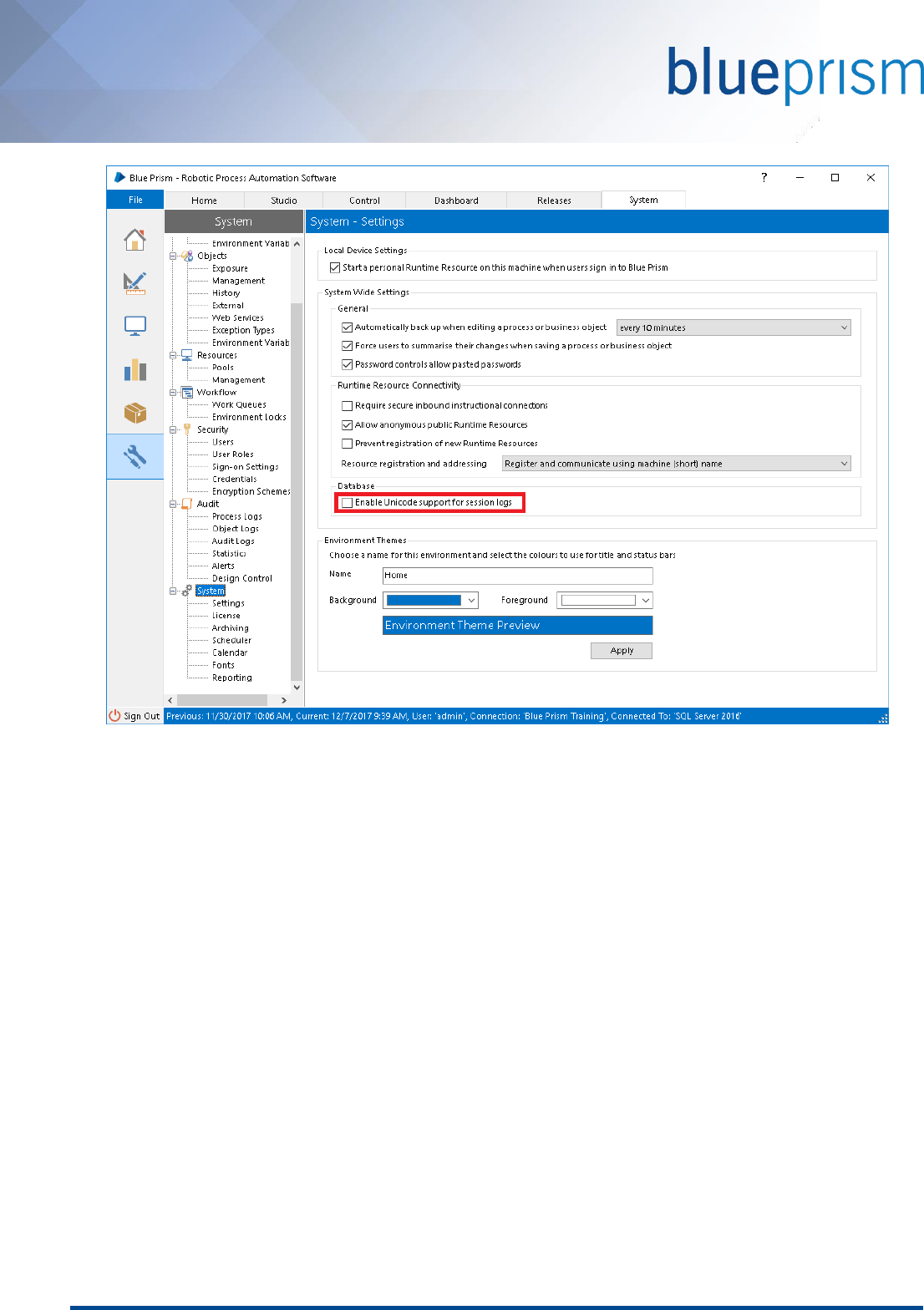 Blue Prism stores log details on the database in the [BPASessionLog_NonUnicode] or [BPASessionLog_Unicode]