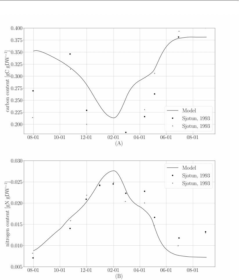 Figure 6: (A) Carbon content expressed as a fraction of dry weight. Solid line, model