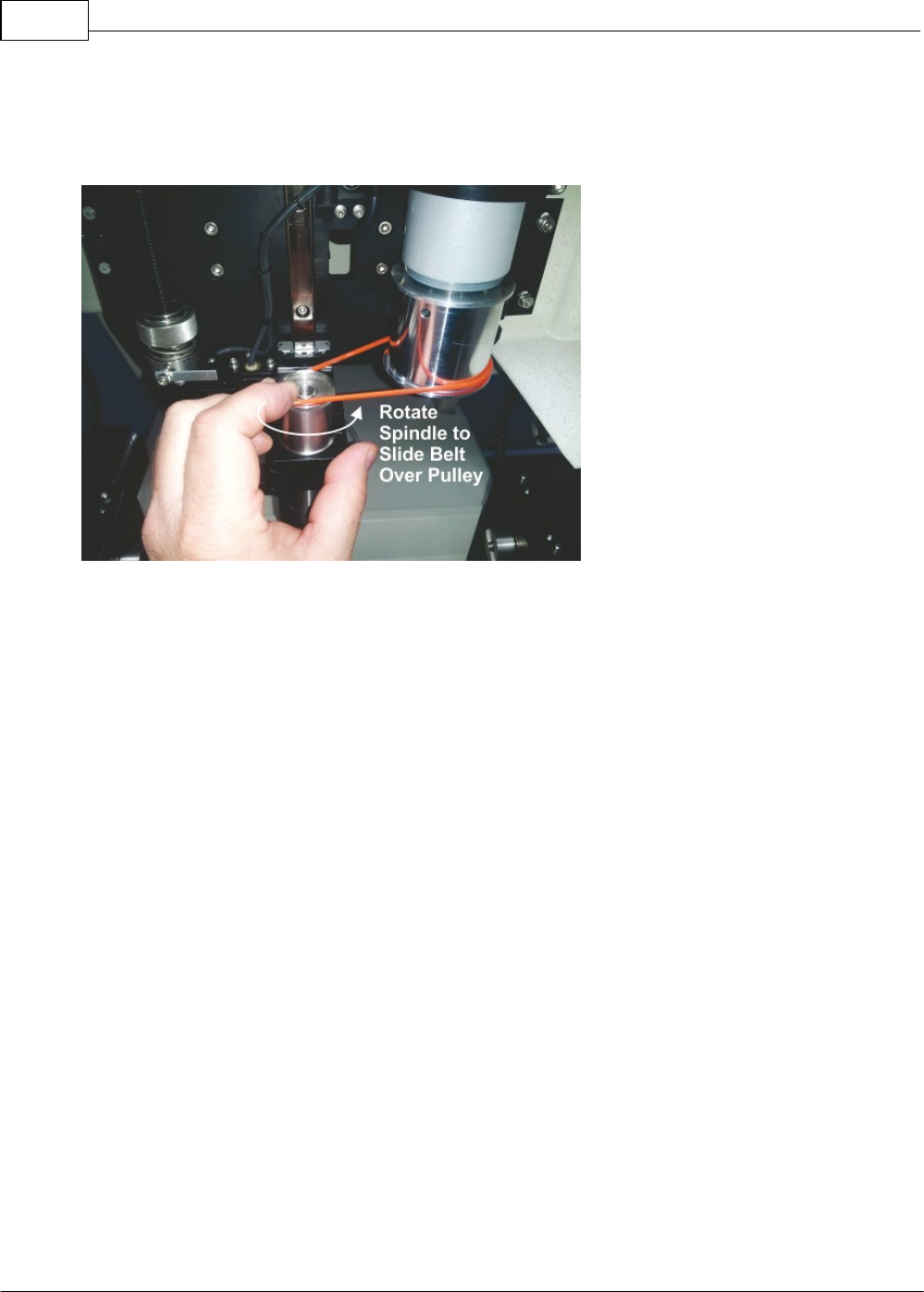 Stretch the belt and rotate the spindle pulley as shown to allow it to roll over the pulley lip. Do not stretch