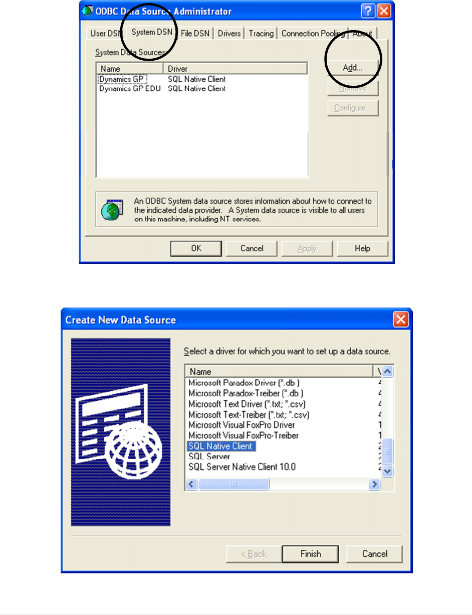 Administrator. Choose System DSN > Add > SQL Native Client > Finish.