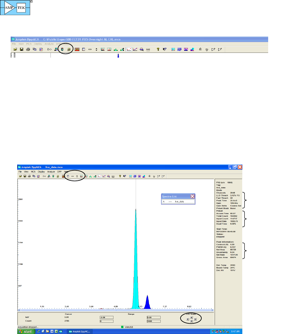 a. The spectrum, counts, and accumulation time are automatically displayed as data are acquired. If a region of