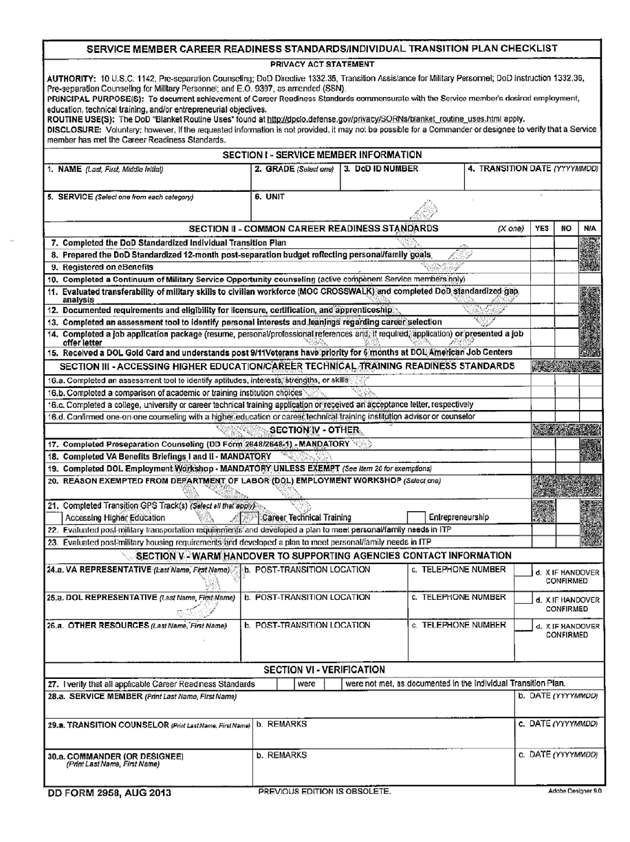 Encl: (1) Sample DD Form 2958 Service Member Career Readiness