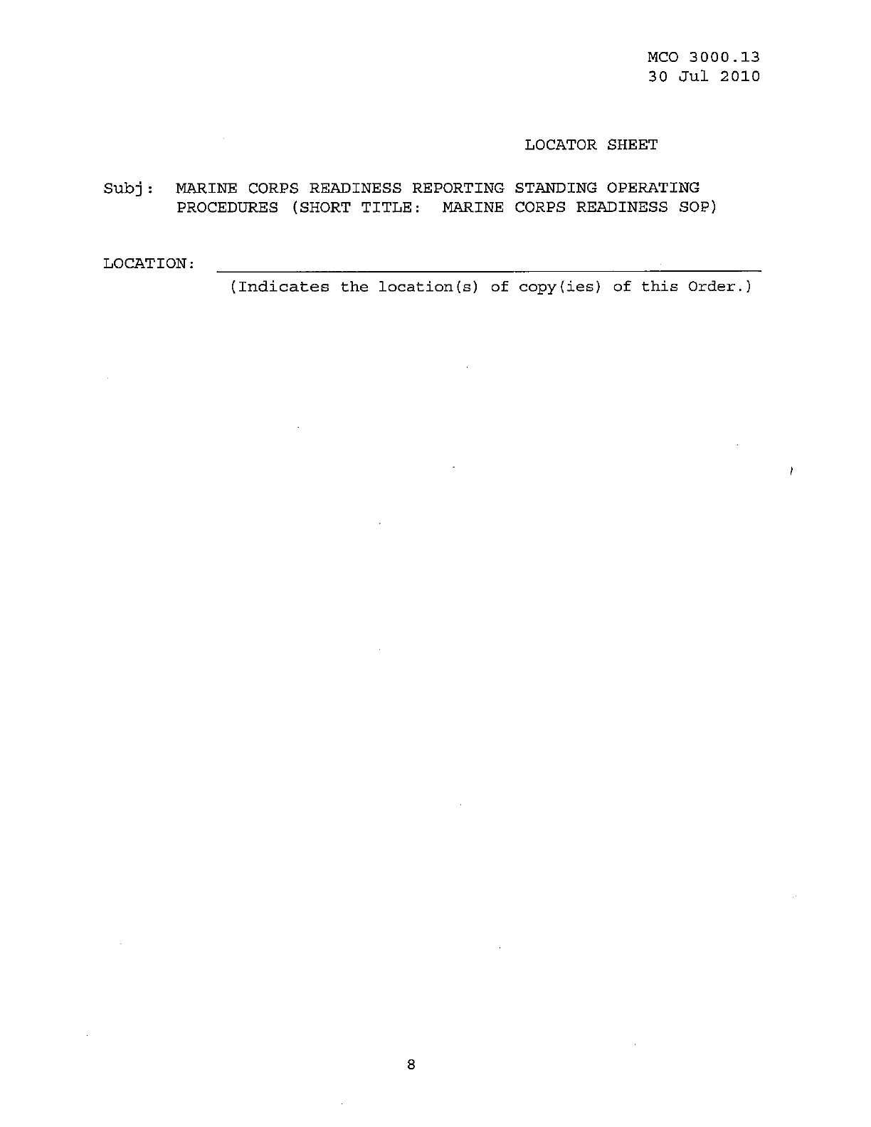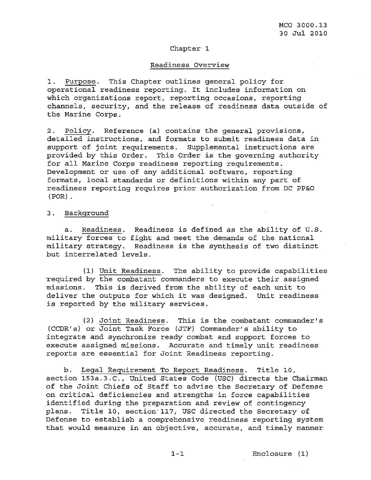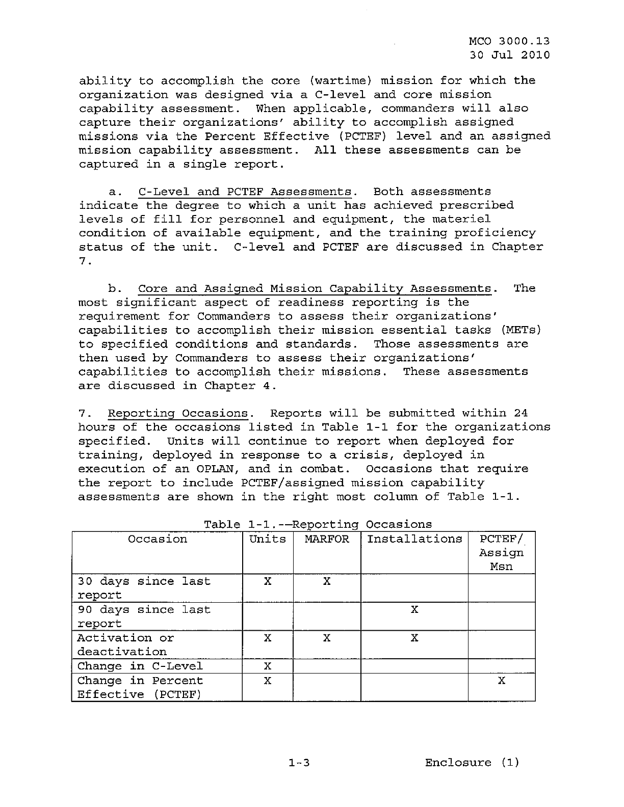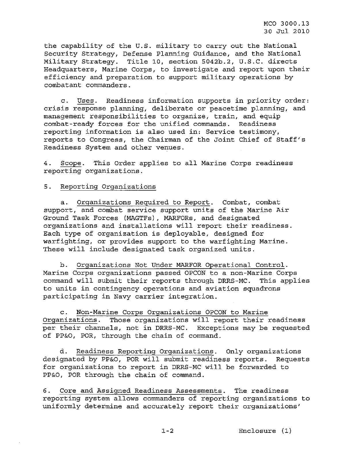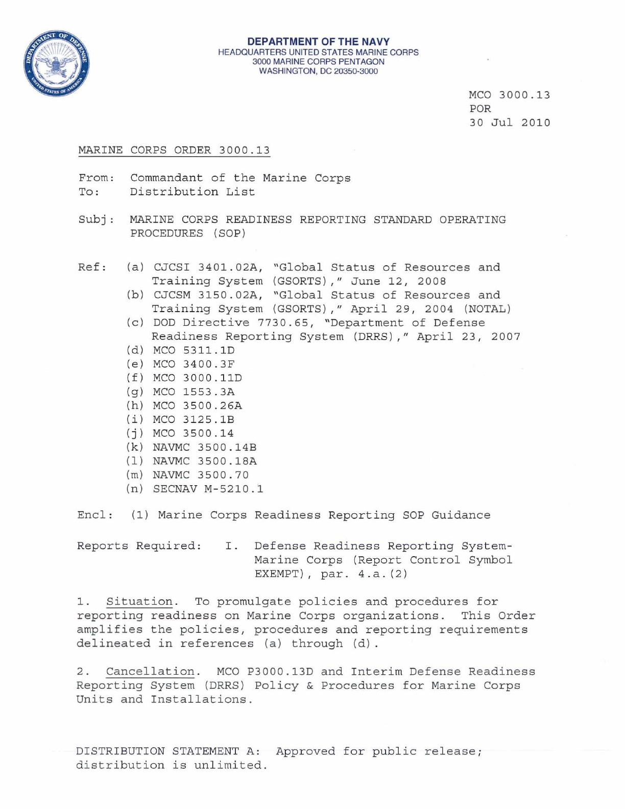 MCO 3000.13 MARINE CORPS READINESS REPORTING STANDARD OPERATING PROCEDURES (SOP) 3000