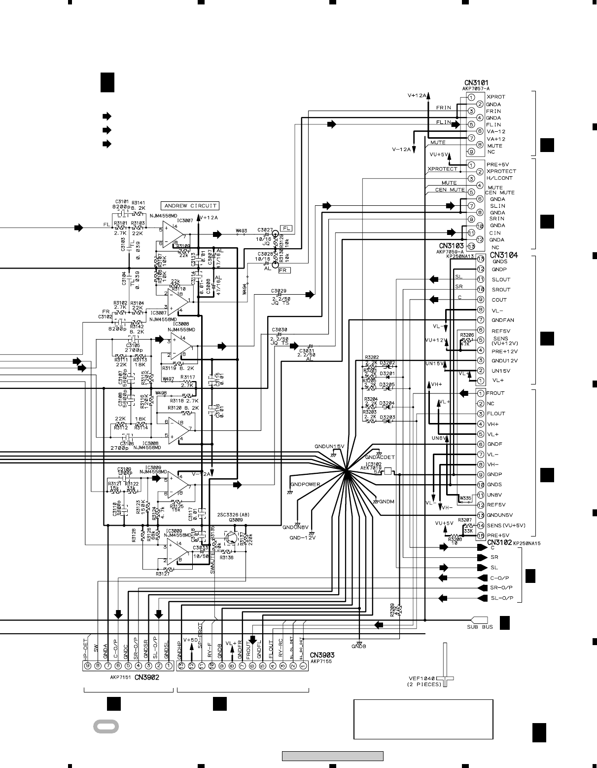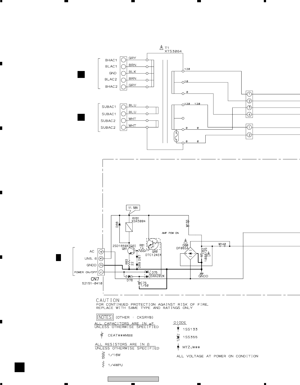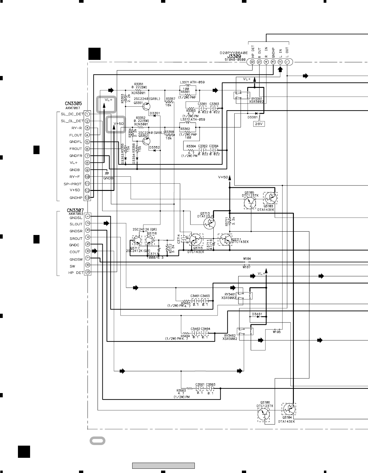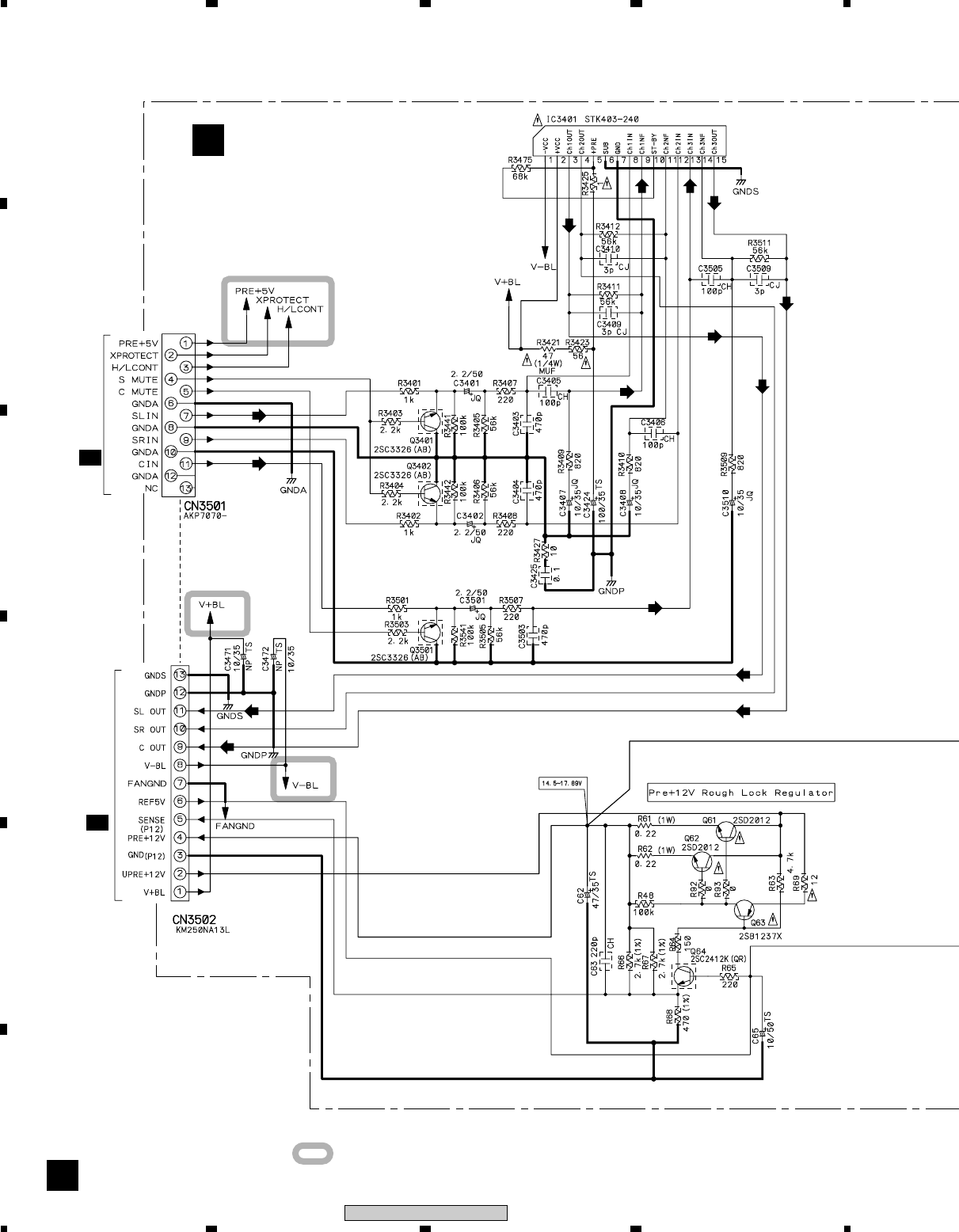 Note : Before the diagnosis, discharge the Amp power line. Connect the resistor of 100Ω or more between W301(VH+), W303(VH–) and