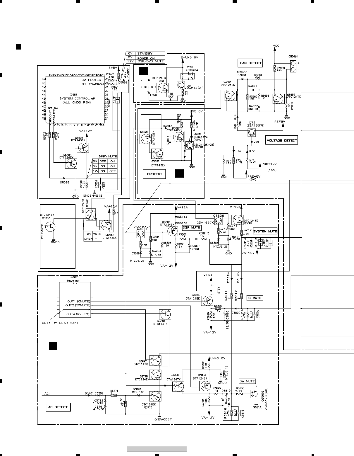 The initial state is “SP Relay is OFF” and “Sys. Mute is ON”. Apply DC+12V to SPCONT so that AMP can output to the speaker terminal.