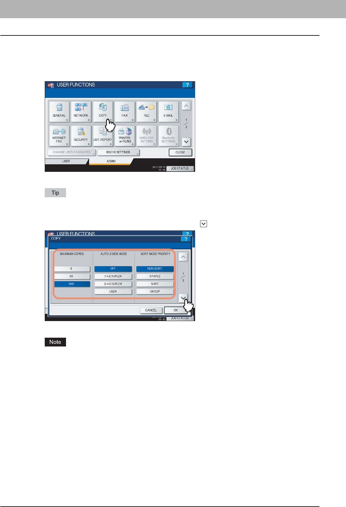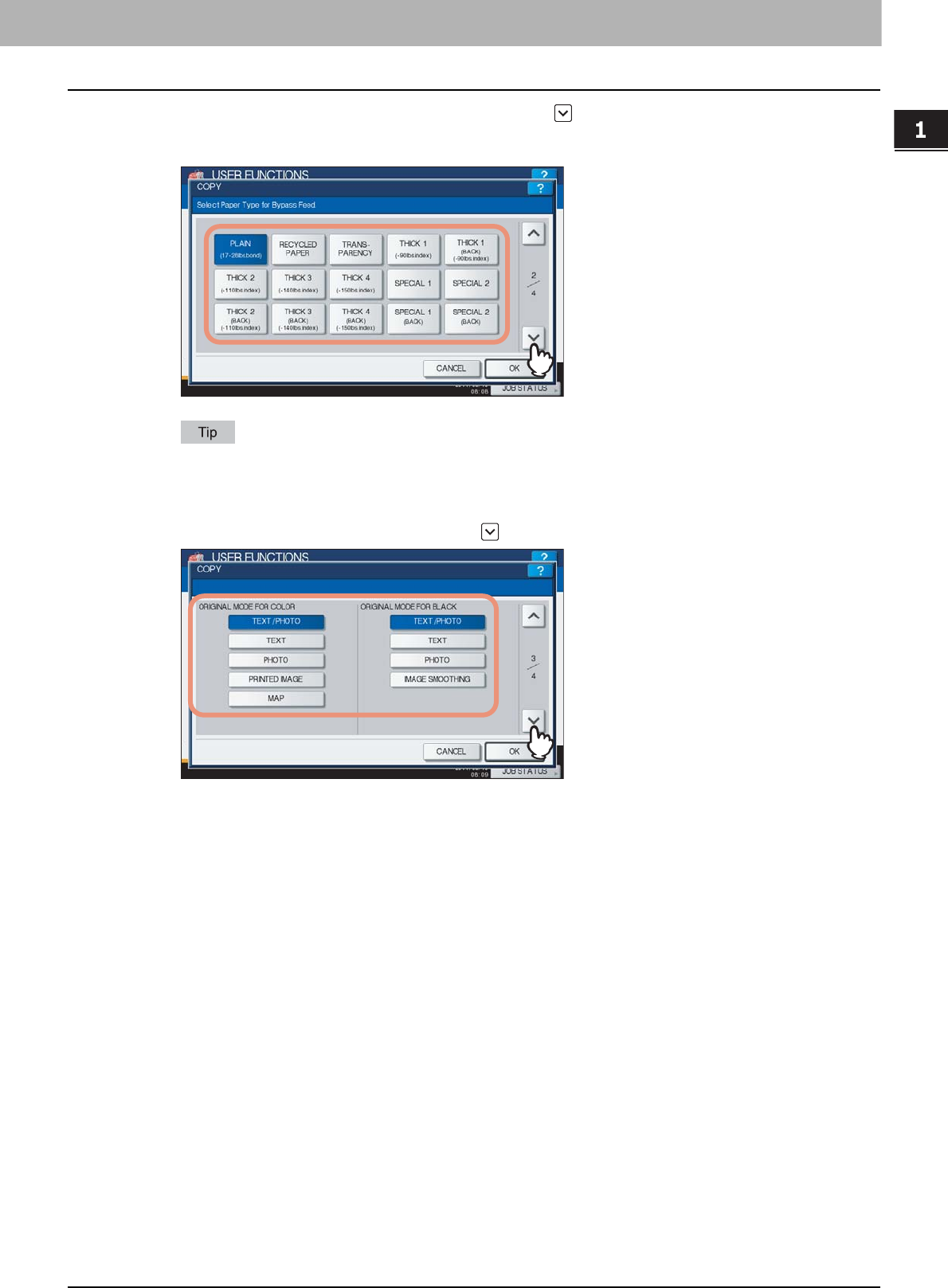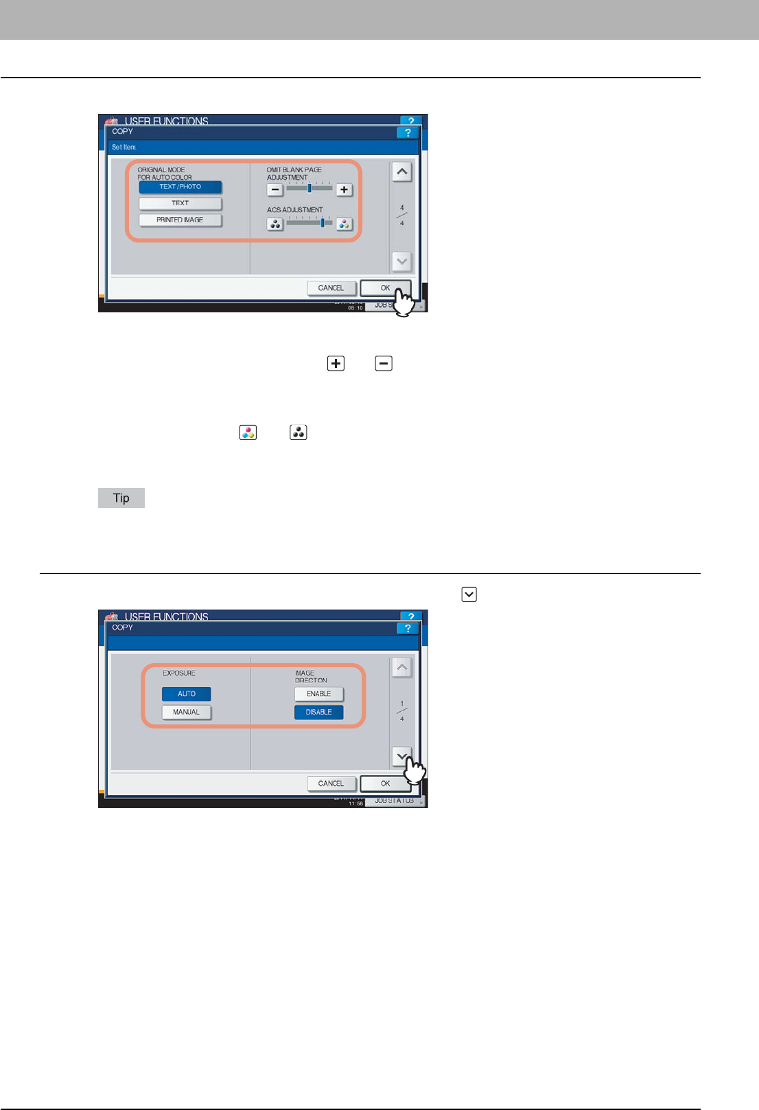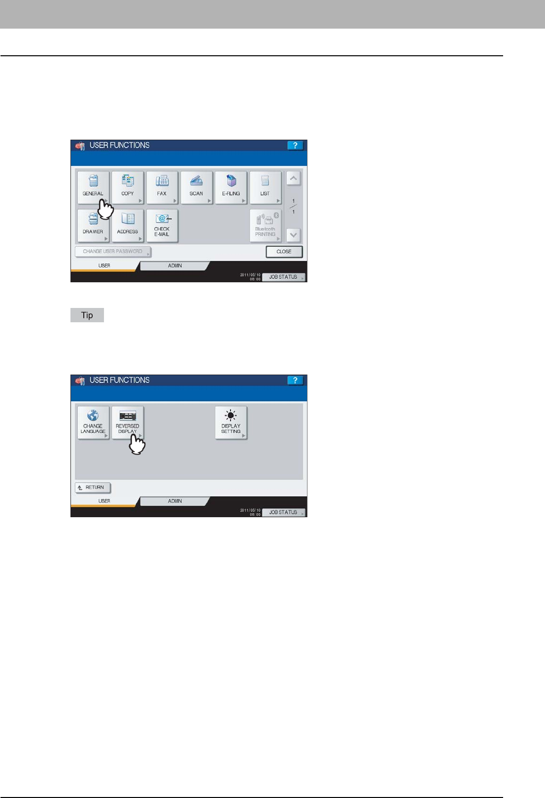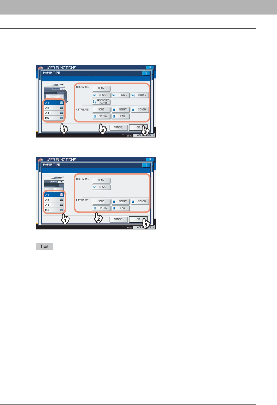 The details on the touch panel menus may differ depending on the operating environment such as whether options are