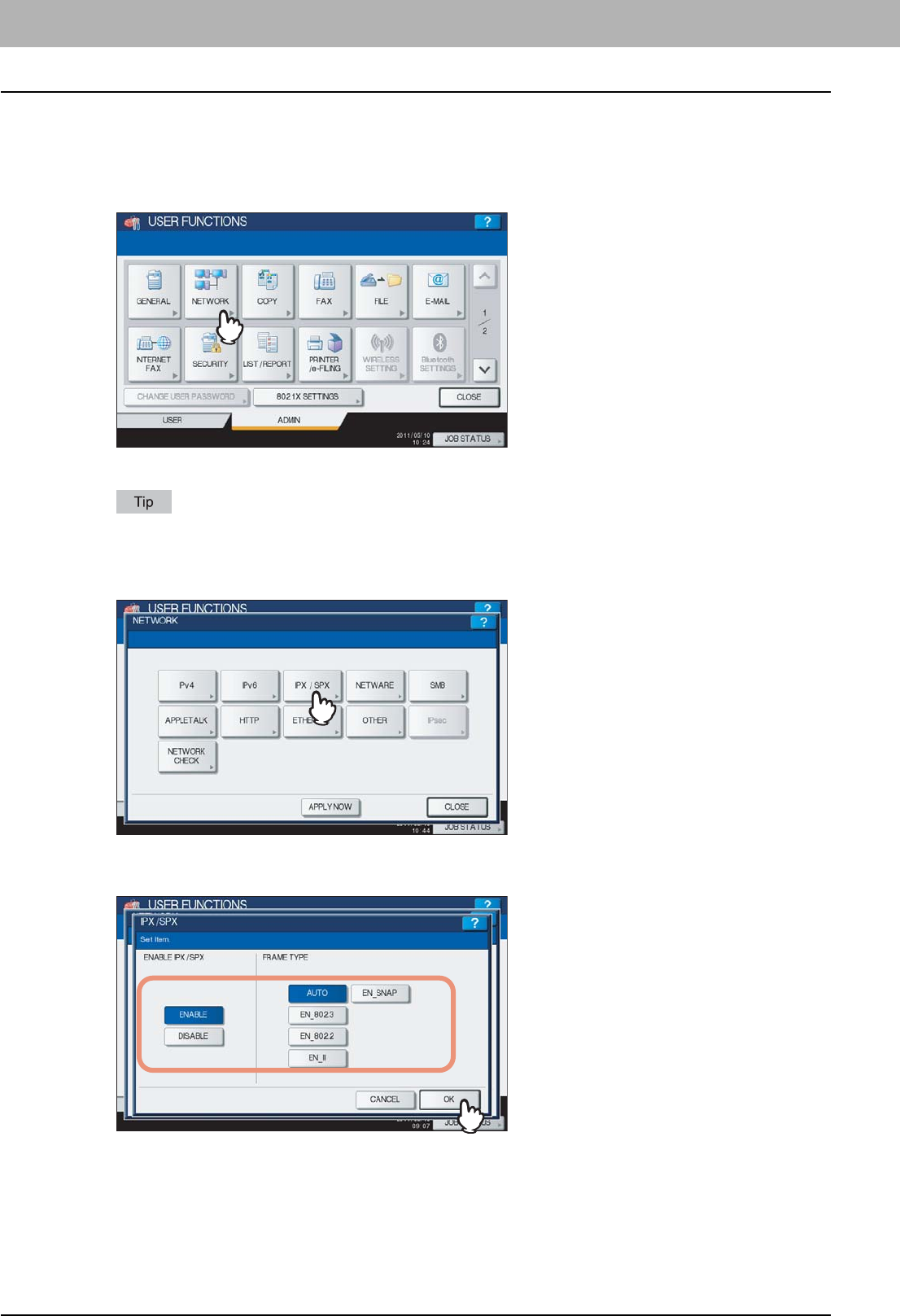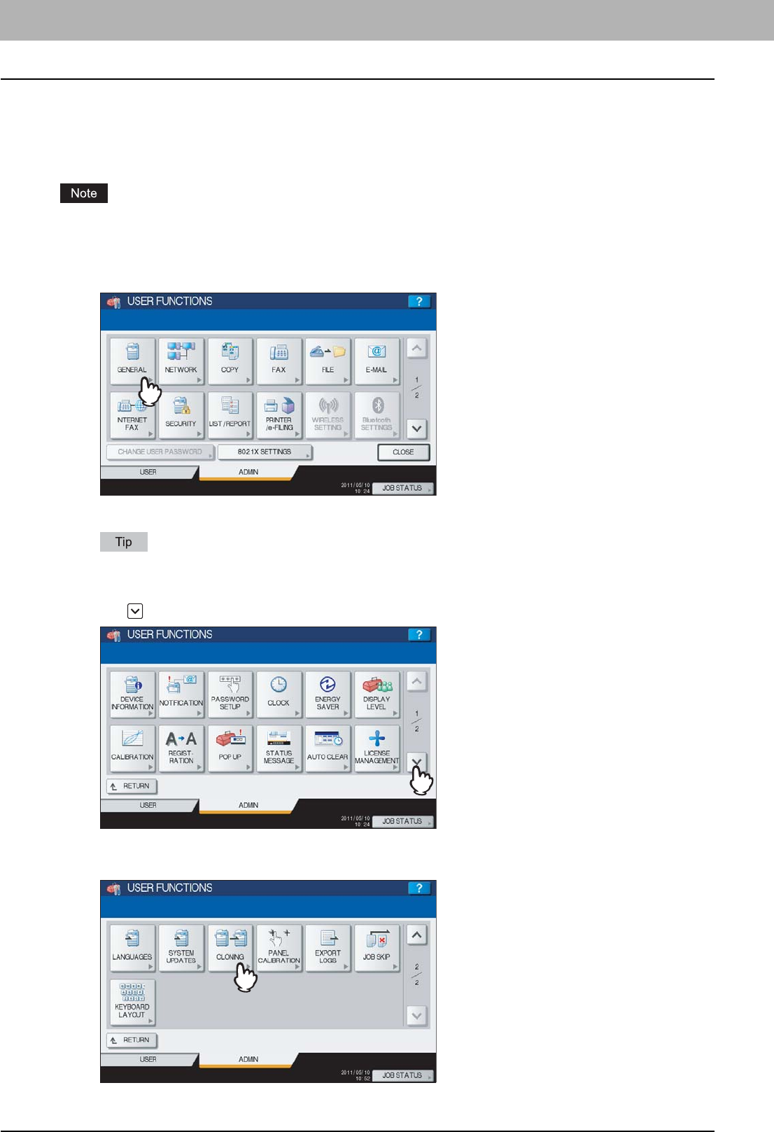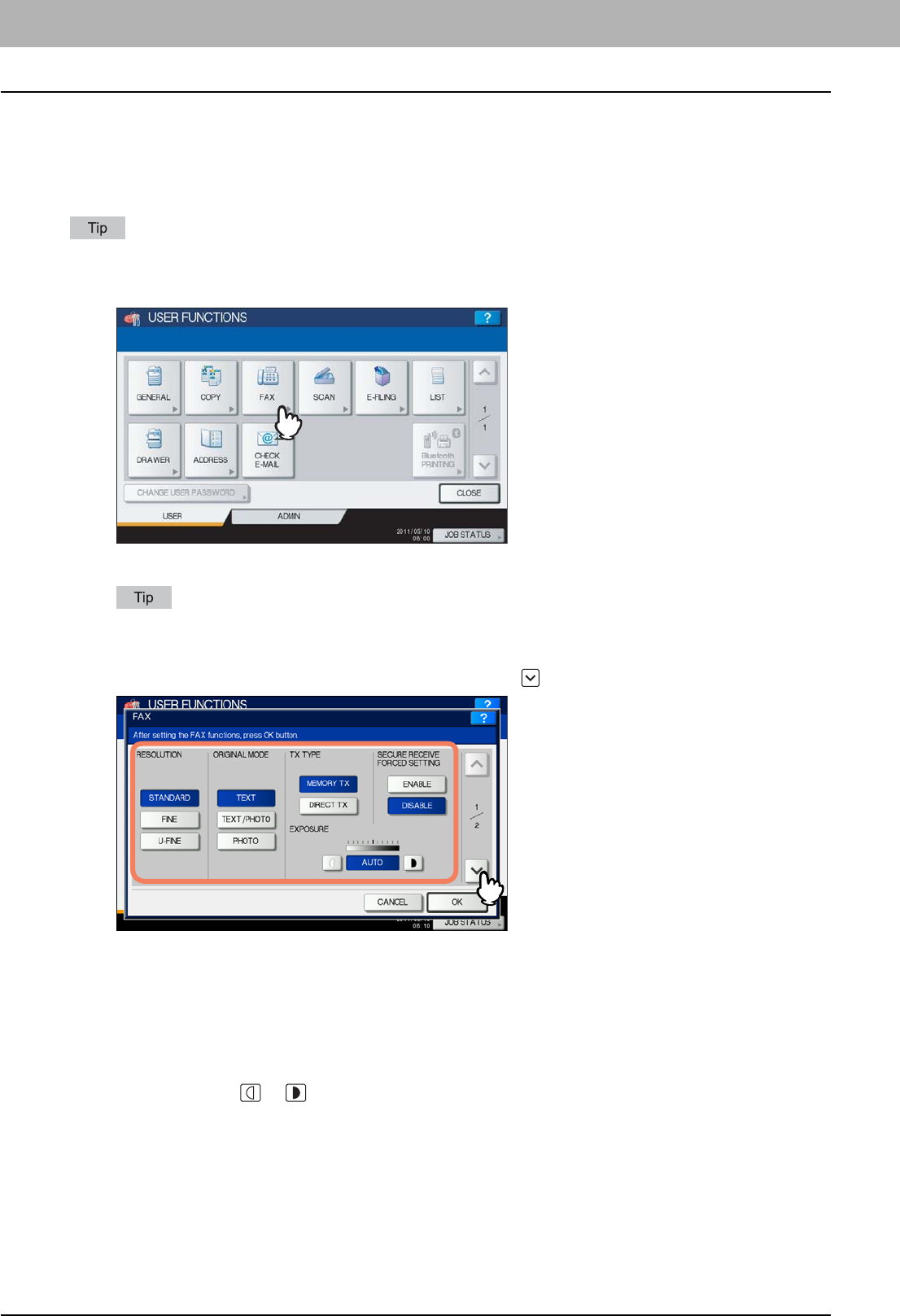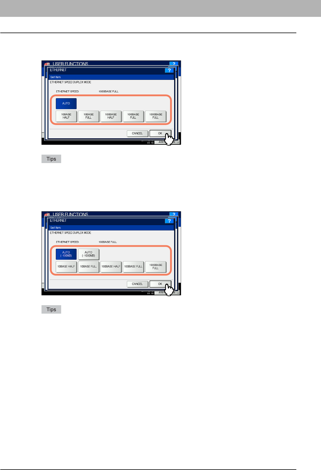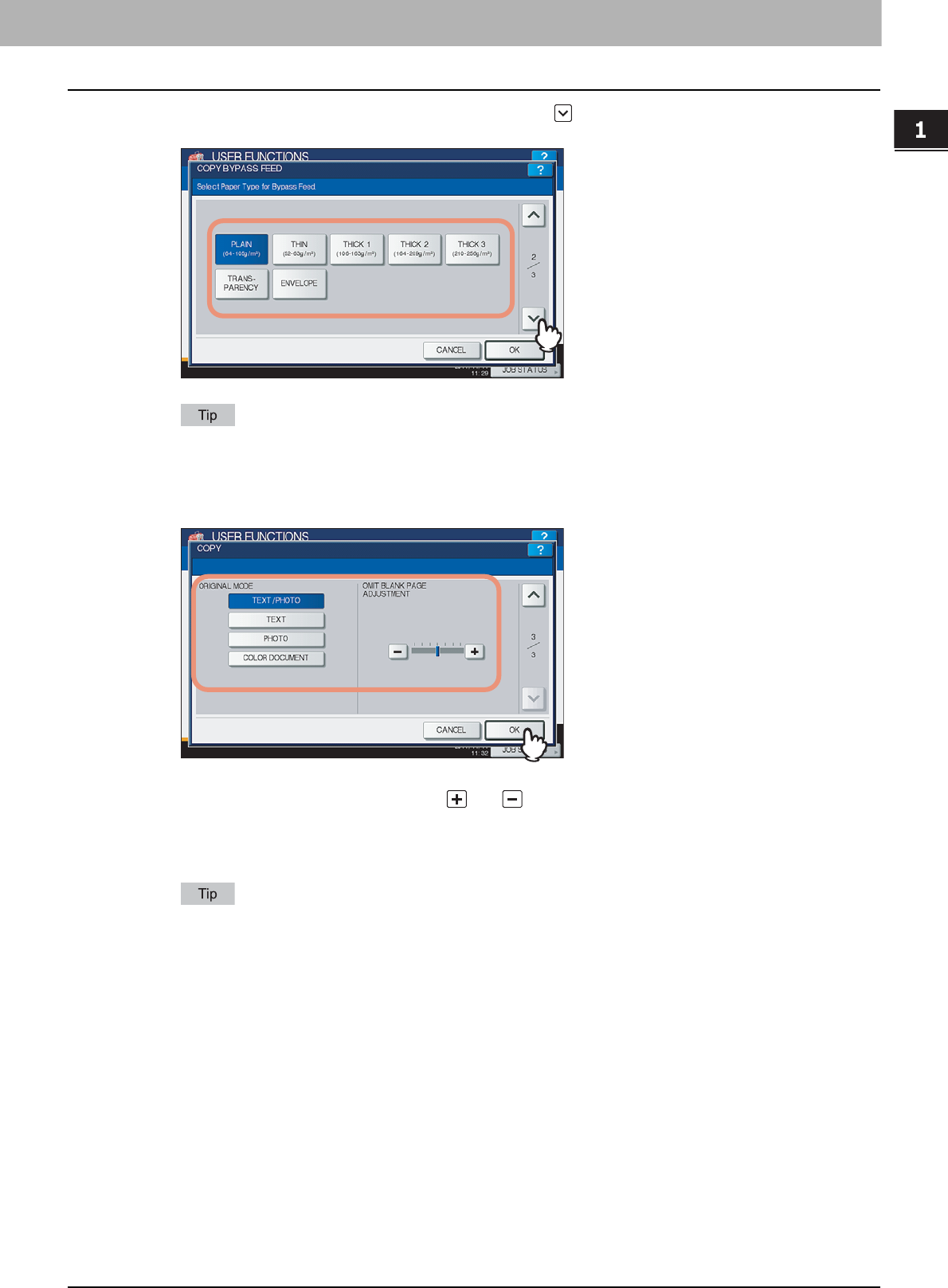 The details on the touch panel menus may differ depending on the operating environment such as whether options are