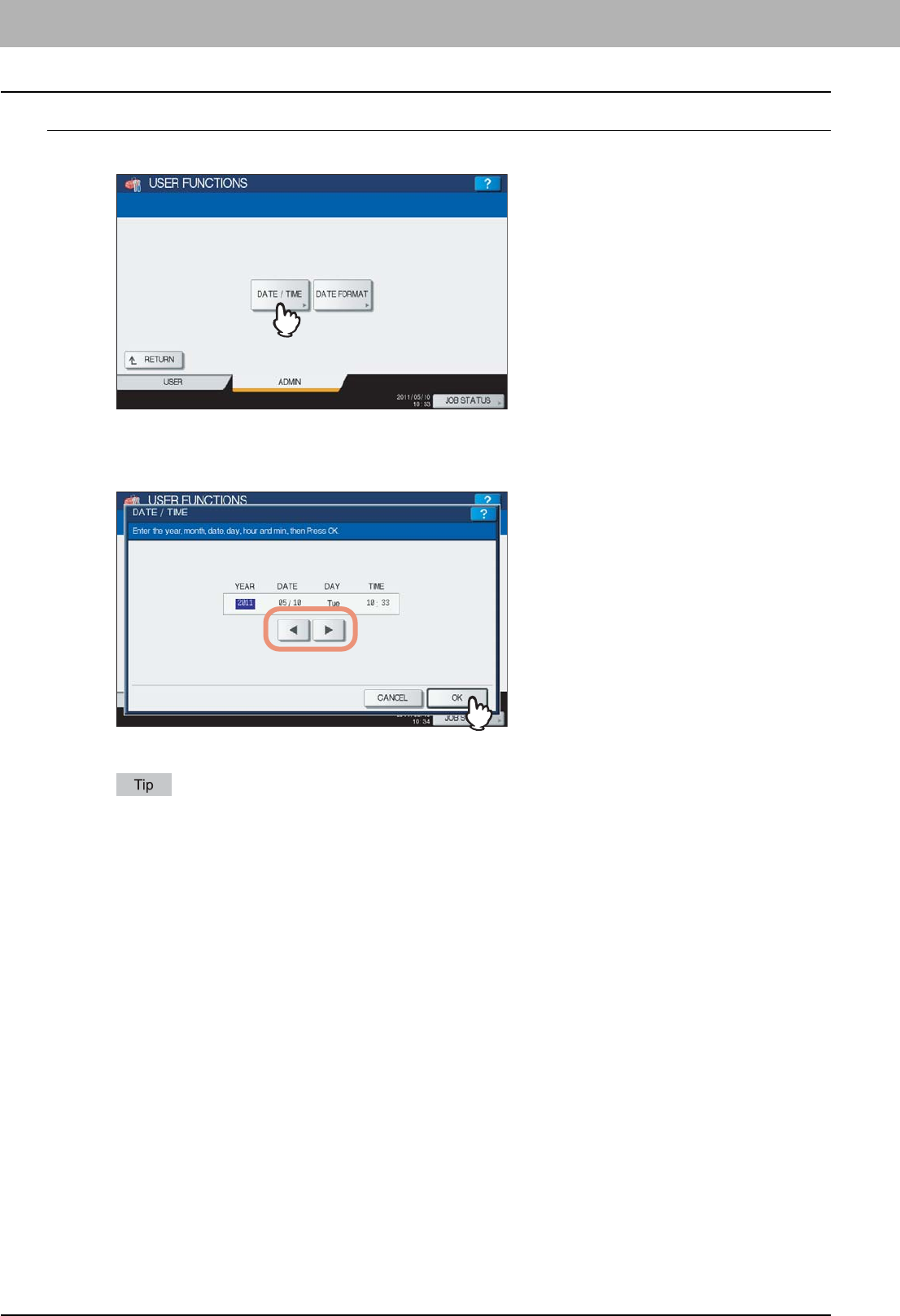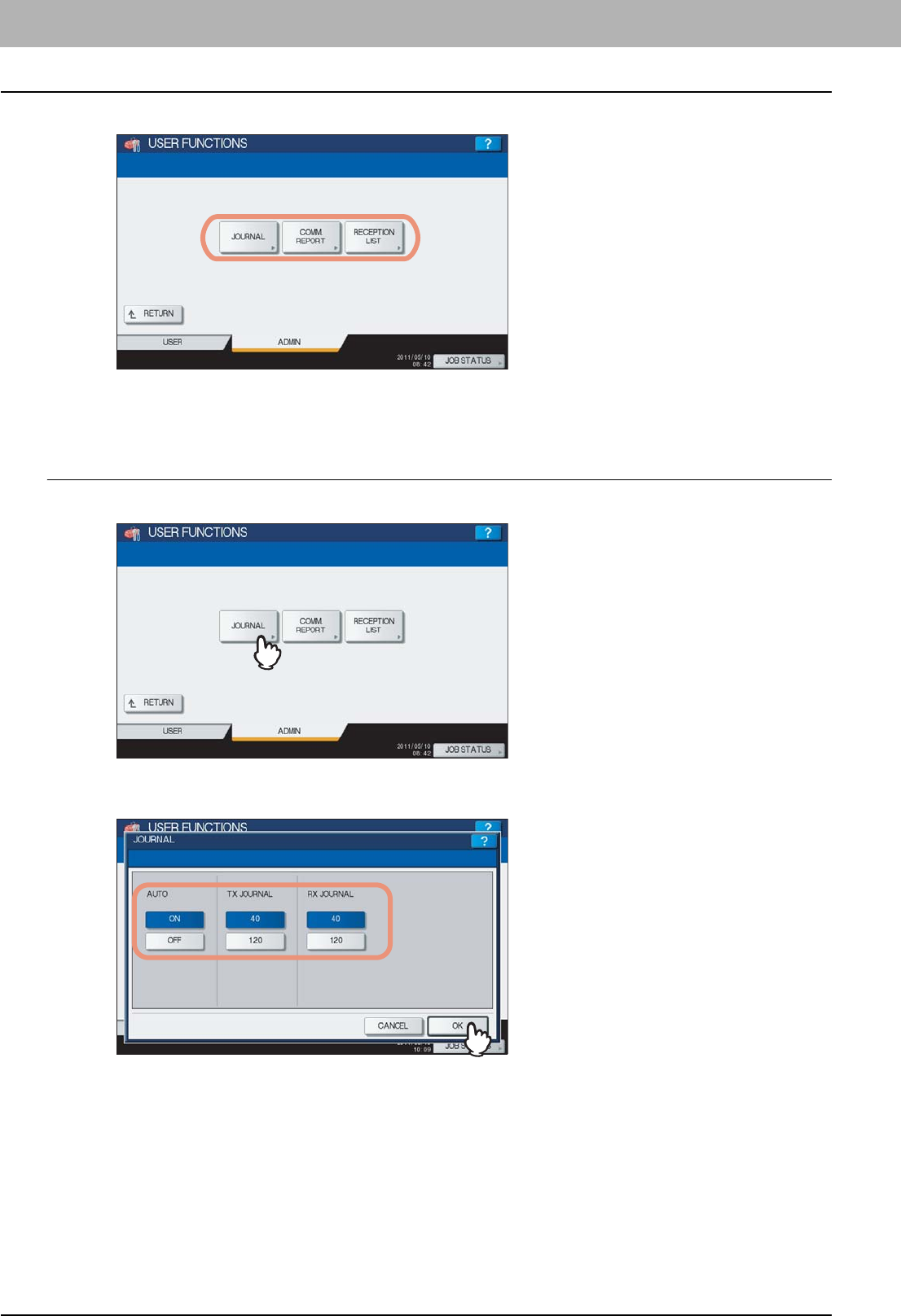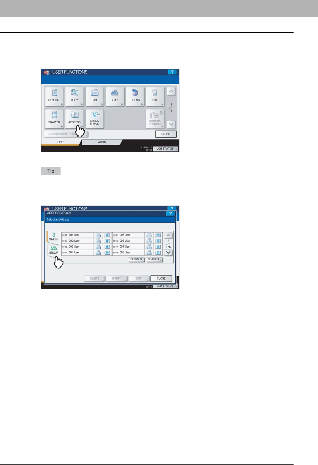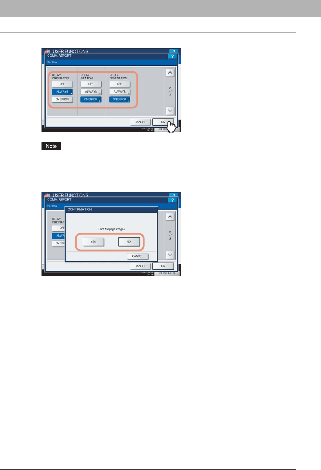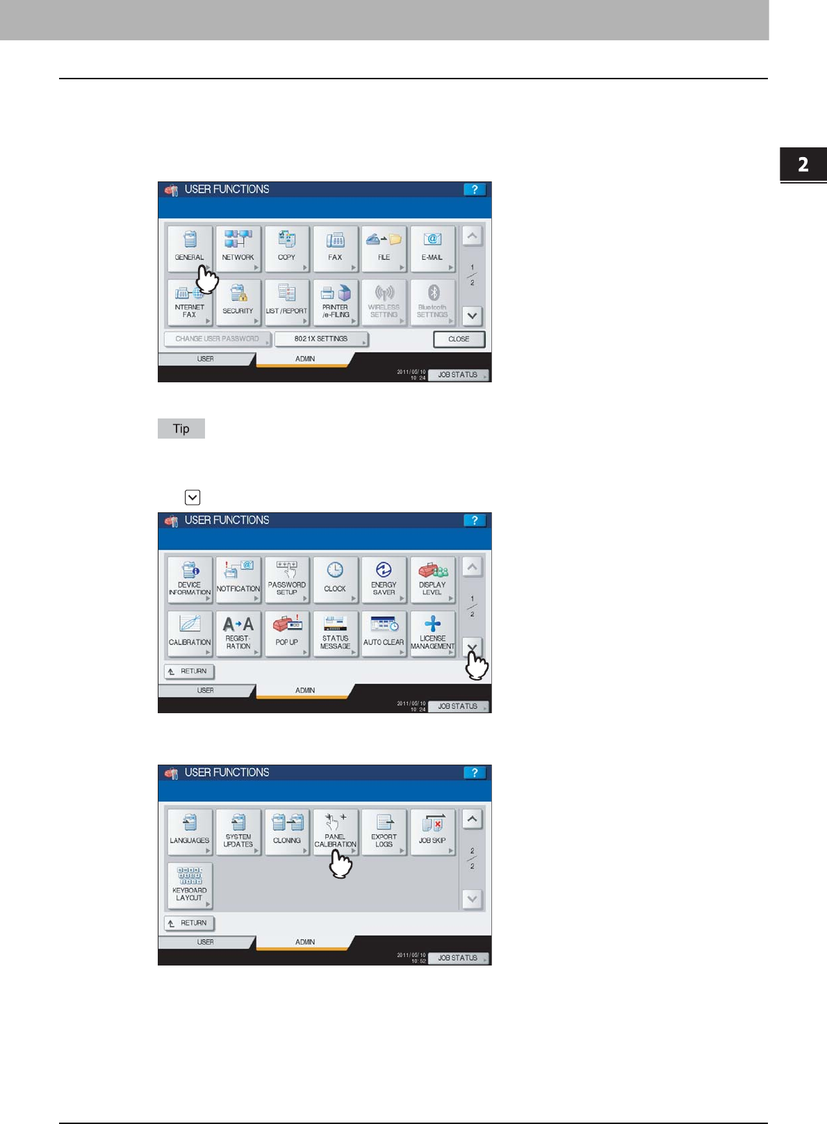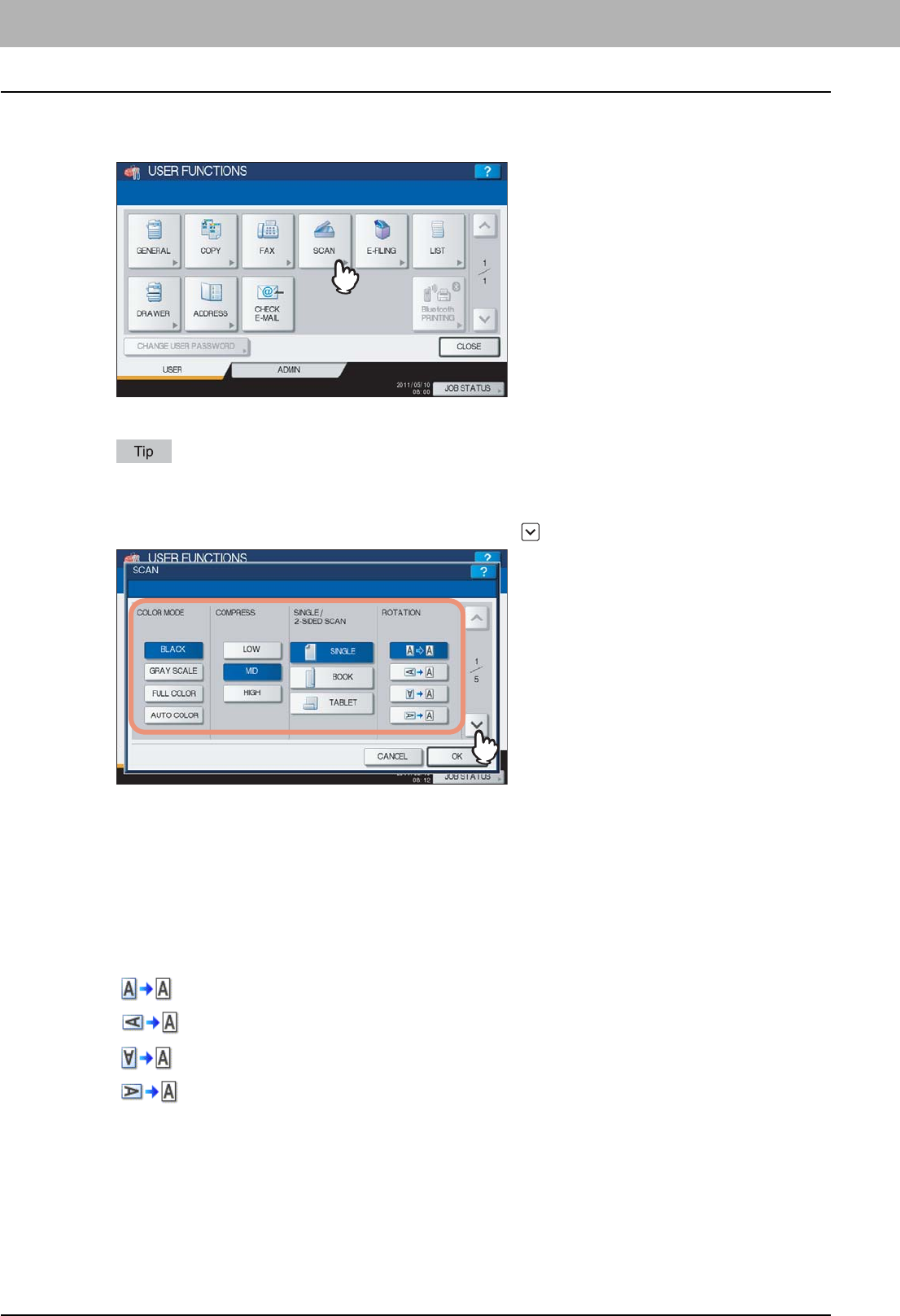 The details on the touch panel menus may differ depending on the operating environment such as whether options are