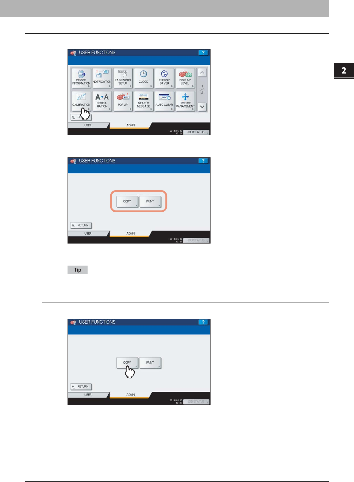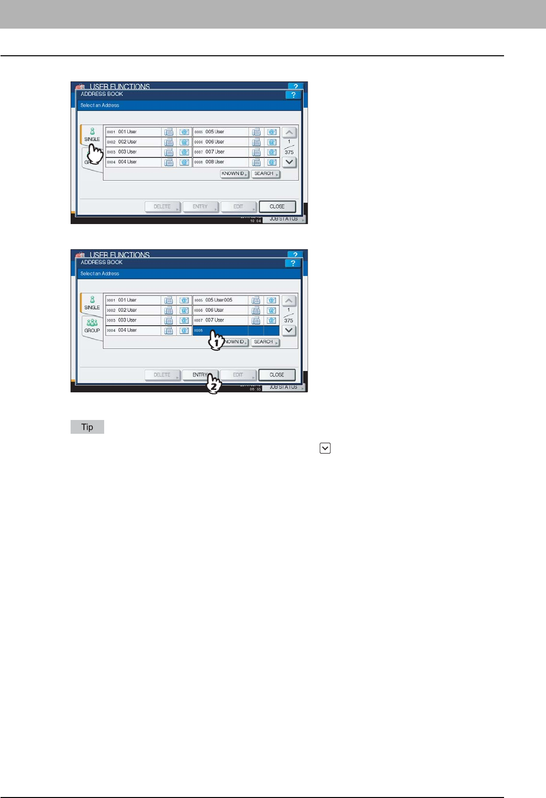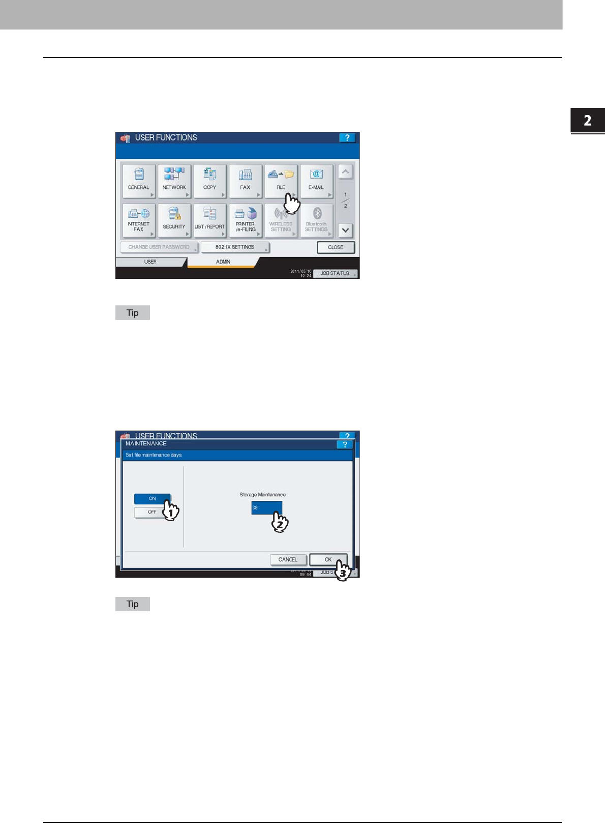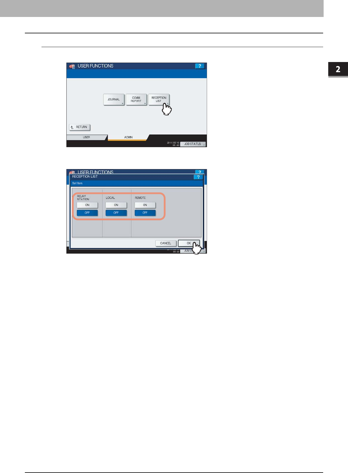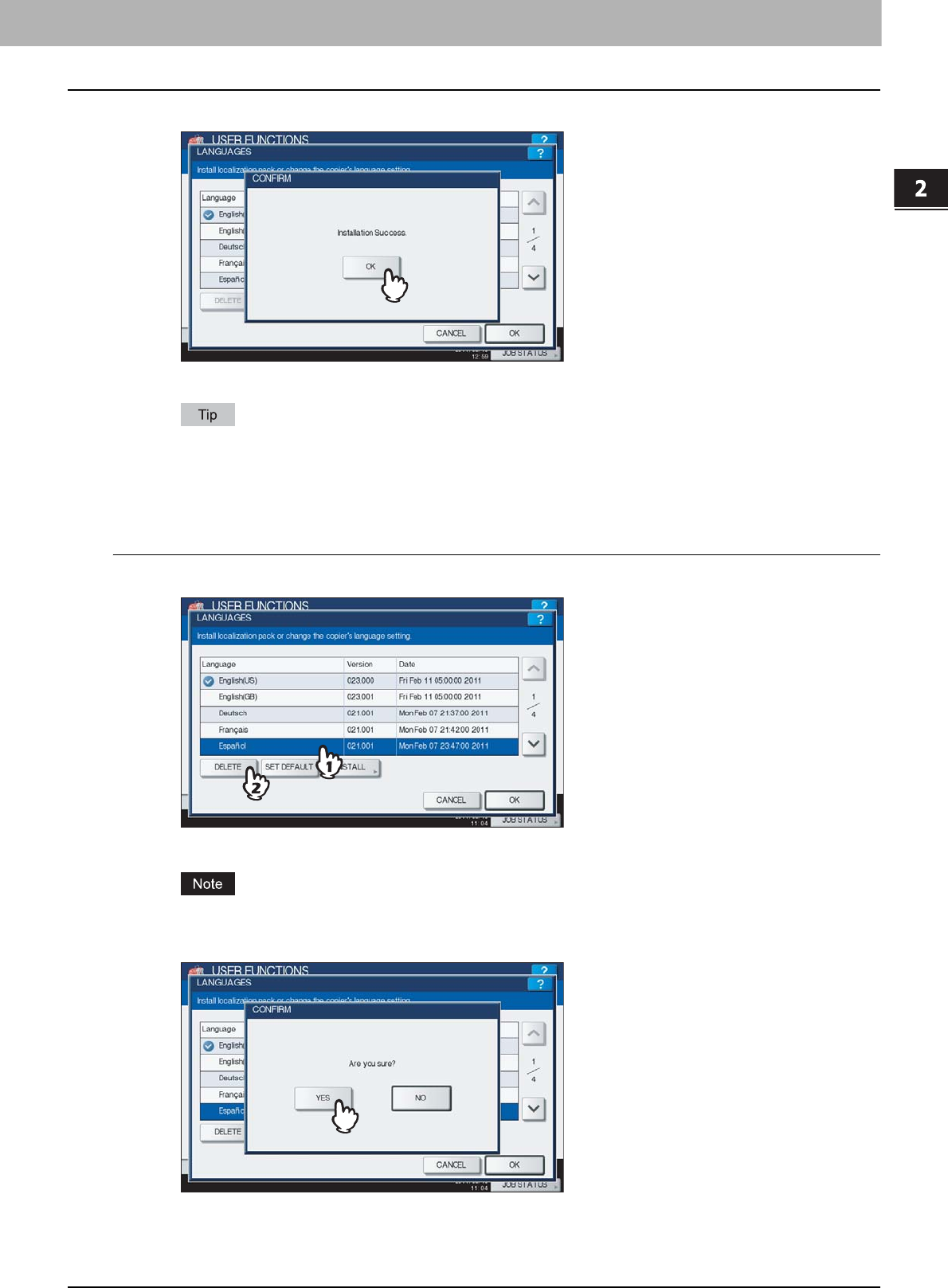 The details on the touch panel menus may differ depending on the operating environment such as whether options are