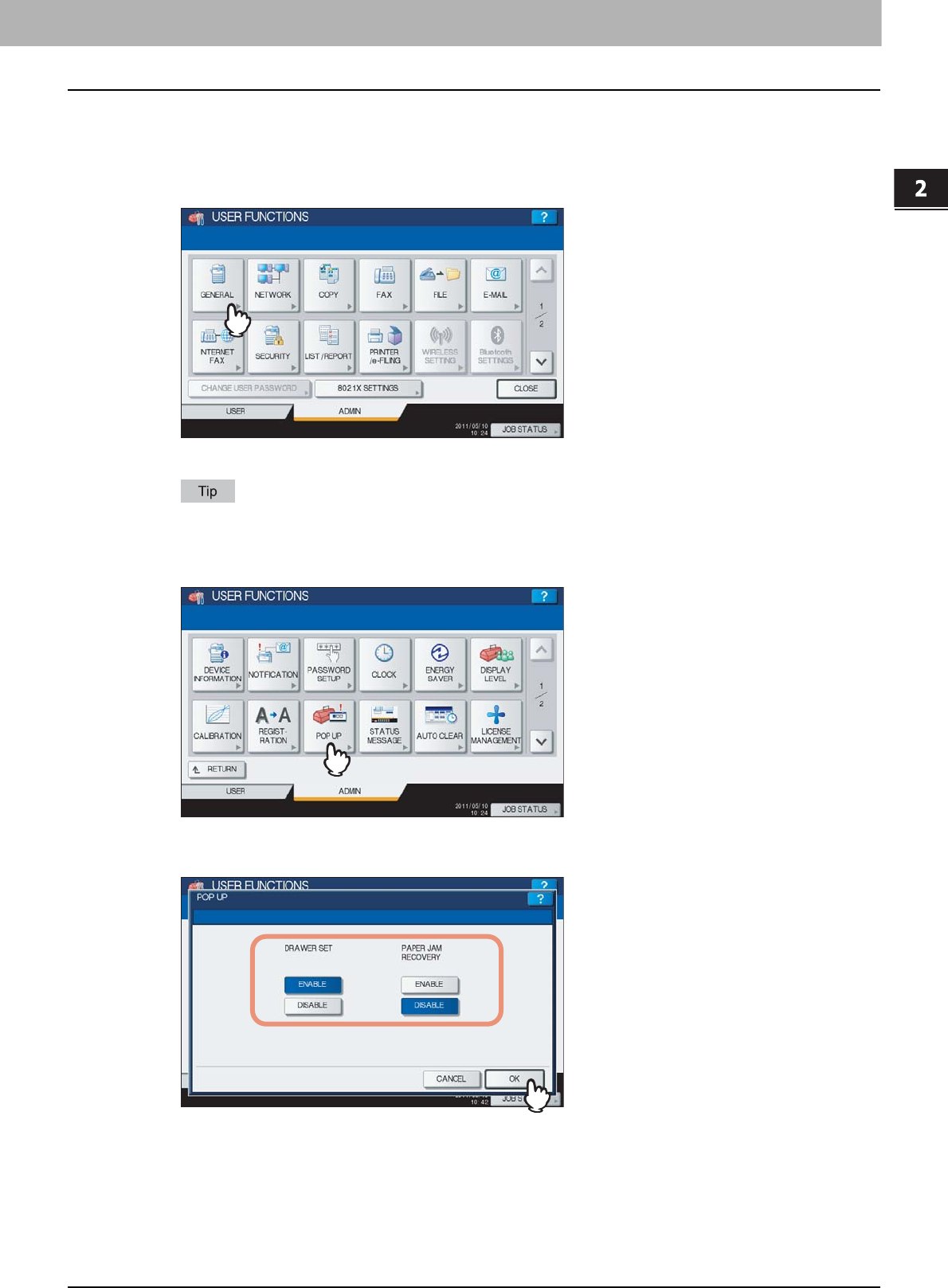 - Setting the drawer set pop-up and paper jam recovery pop-up