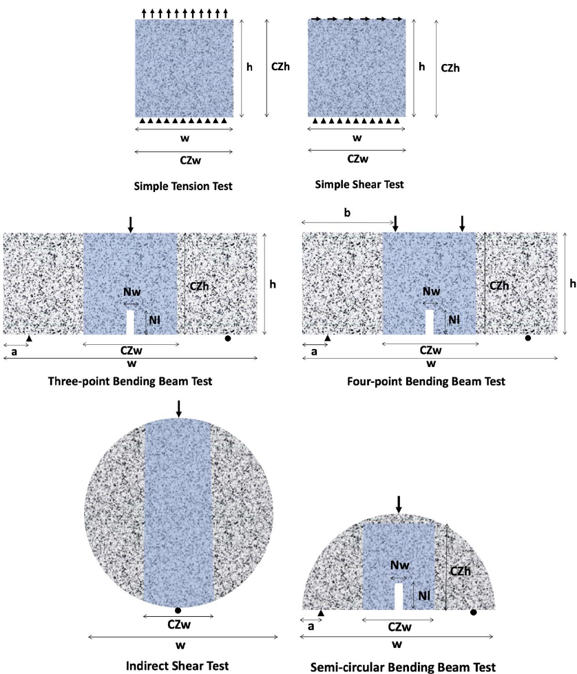 test, Three-point bending beam test, Four-point bending beam test, Semi-circular bending beam test