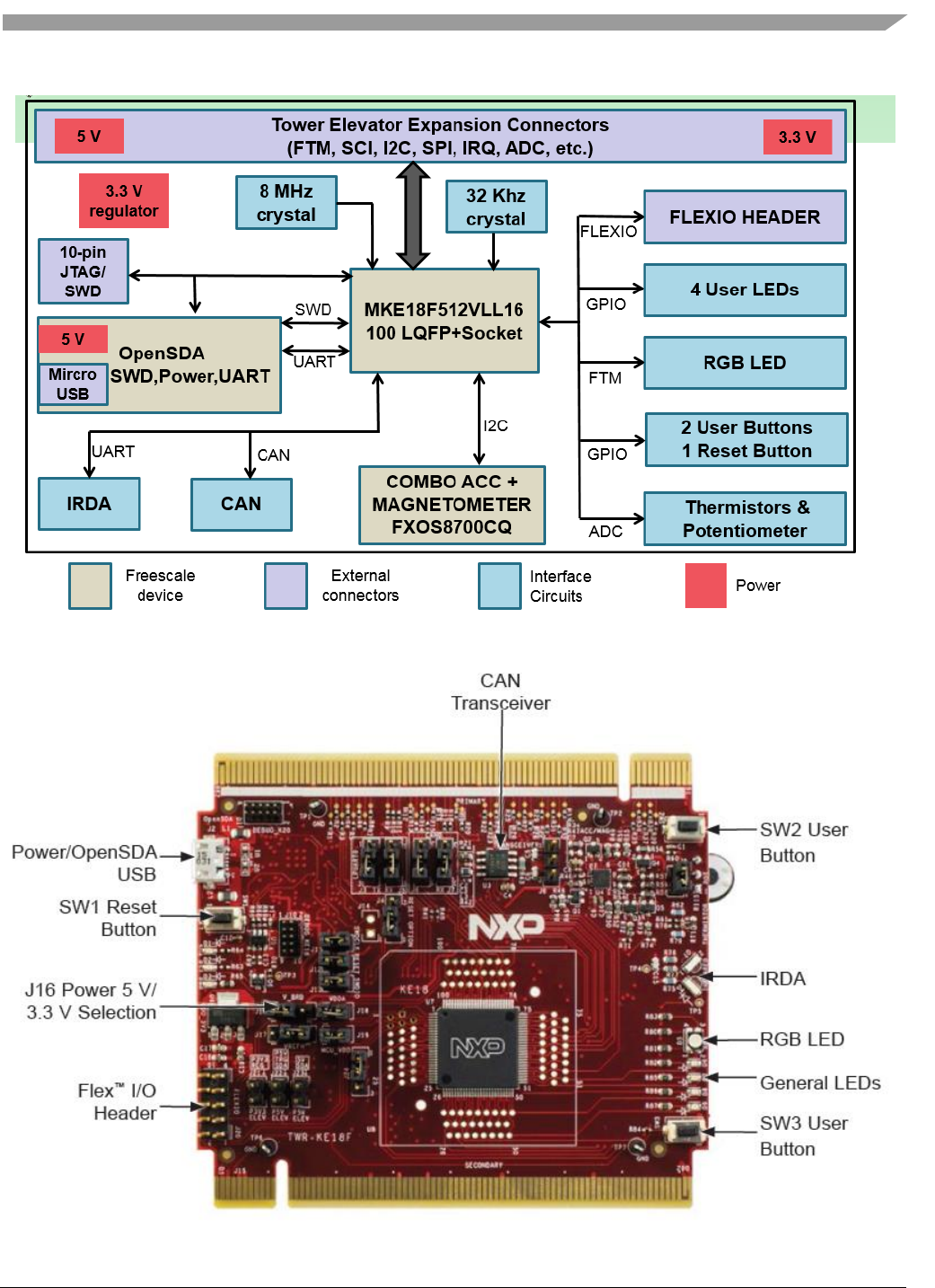 The TWR-KE18F hardware is a NXP Tower development board assembled with the following features: